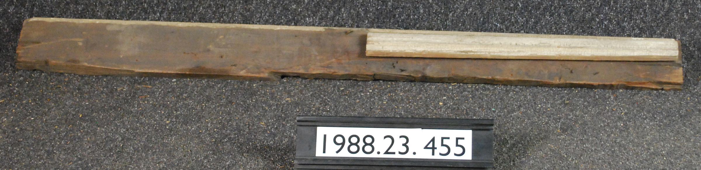 Exterior wood molding nailed onto plain board. (Possible window frame fragment?). Painted off-white. Inscriptions or Markings: Manufacturer: Place of Manufacturer: Design motif: Style: Finish: Painted Off-White