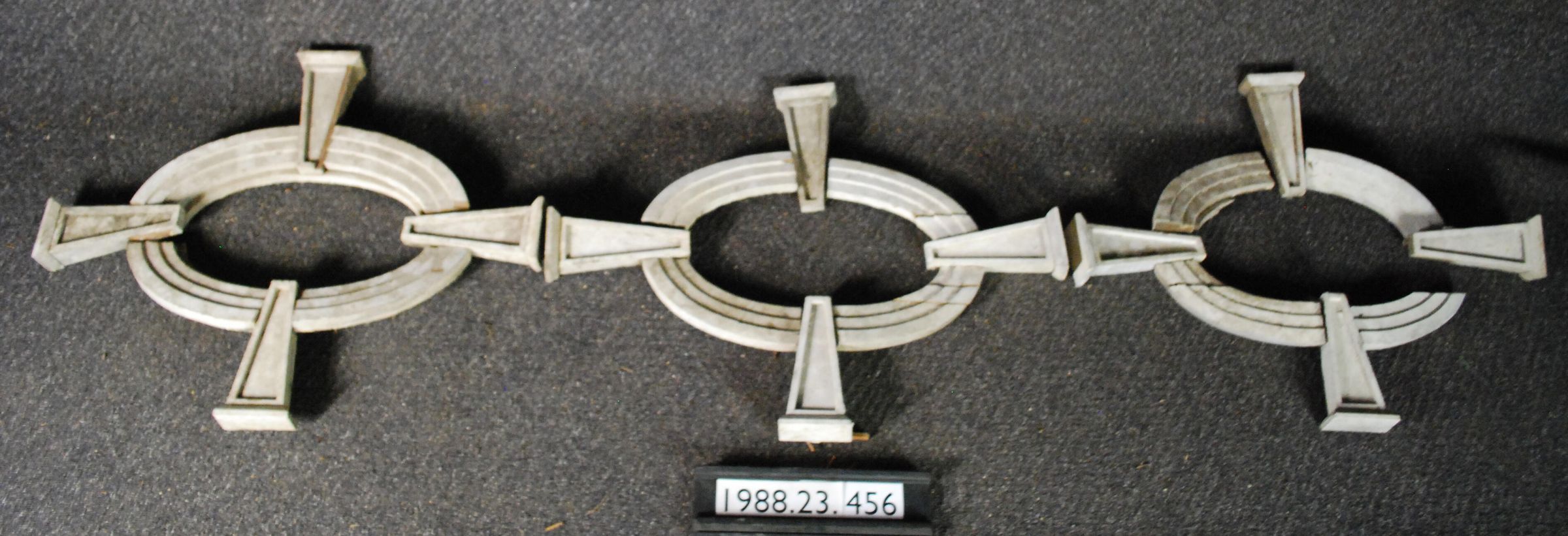 One lot of three oval windows formed by casings and keystones. Each window has four keystones and four carved casing pieces. None dissembled. Painted white.
