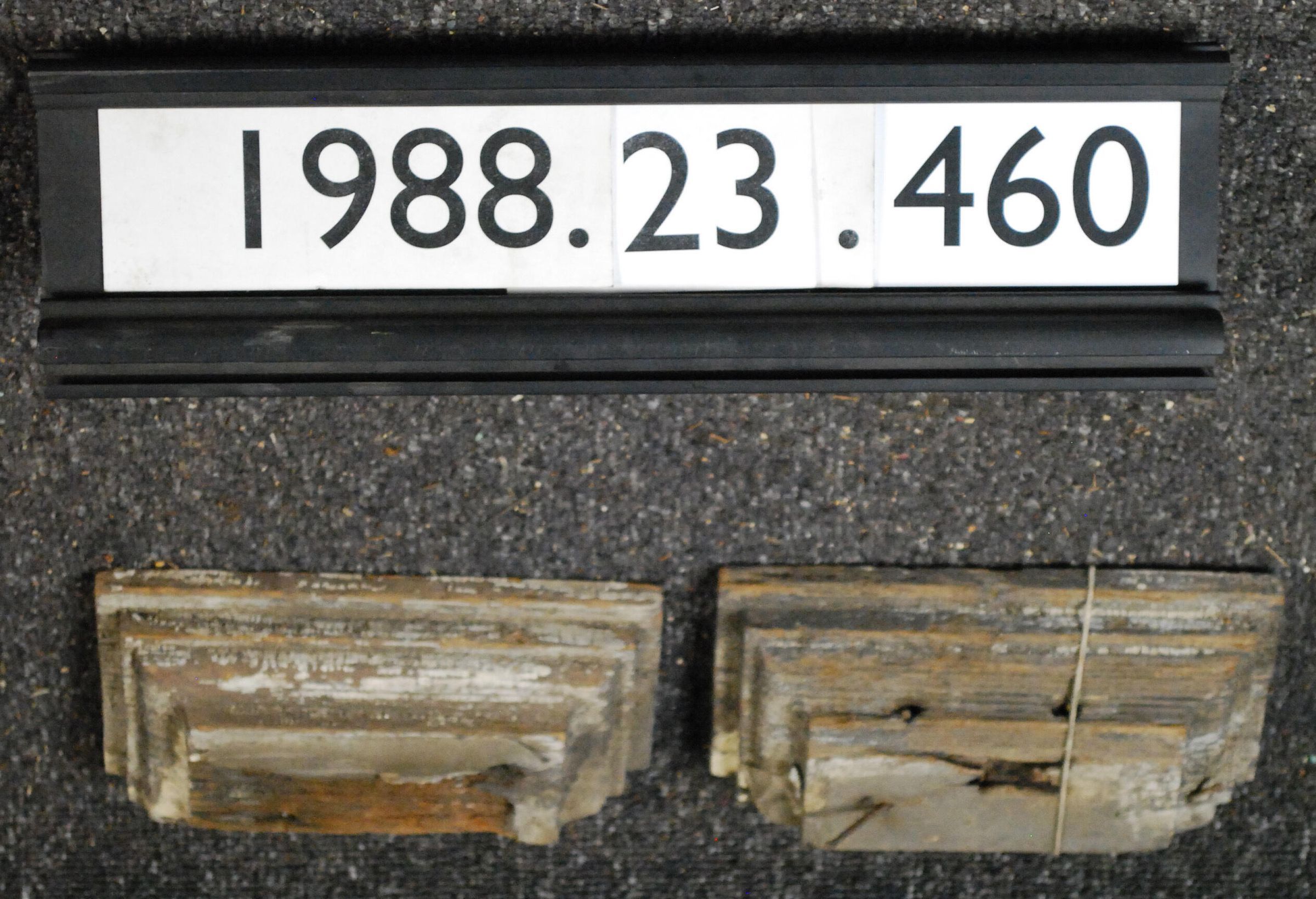 One lot of two exterior wood trim pieces. Compound contour. Severe decay. Remnants of white / red paint.