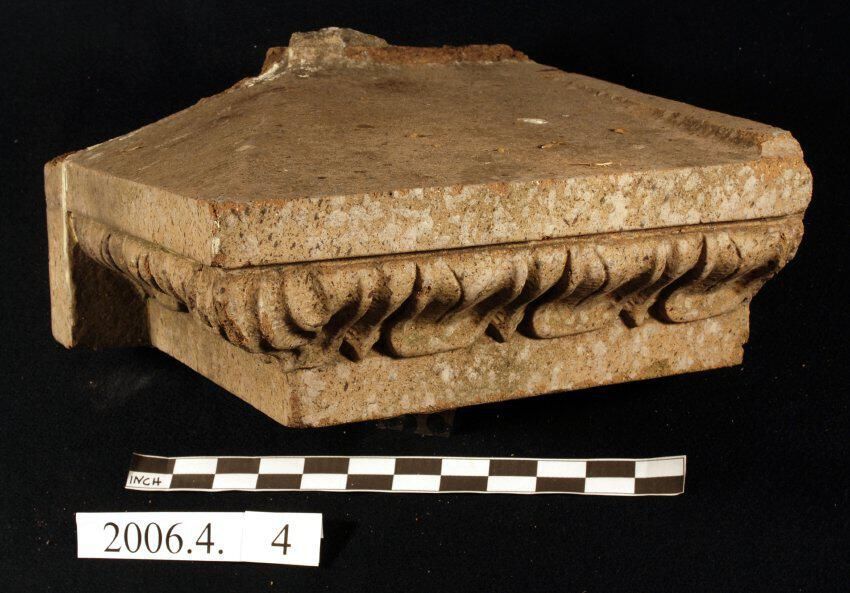 Mottled-speckled glazed terra cotta "Z" shaped corner block. Has botanical motif. Frieze panels on two sides. Hollow back filled with mortar / grout. Salvaged from Congress Hotel - N. E. corner of 6th Avenue and Main Street, Portland, Oregon. Demolished 1978.