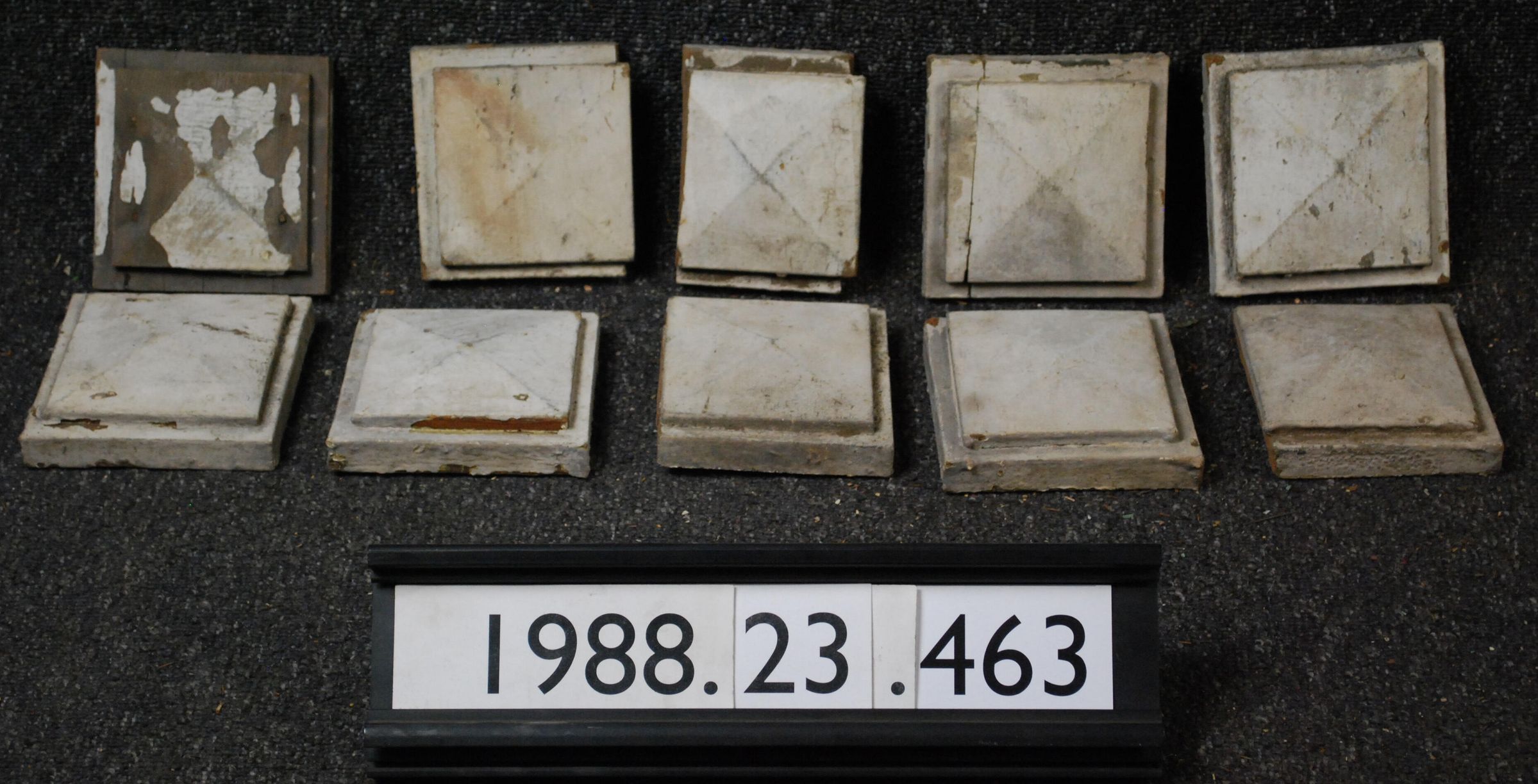 One lot of ten exterior wood blocks, each with pyramidal ornament. Six are complete. Four have truncated edges. Painted white.