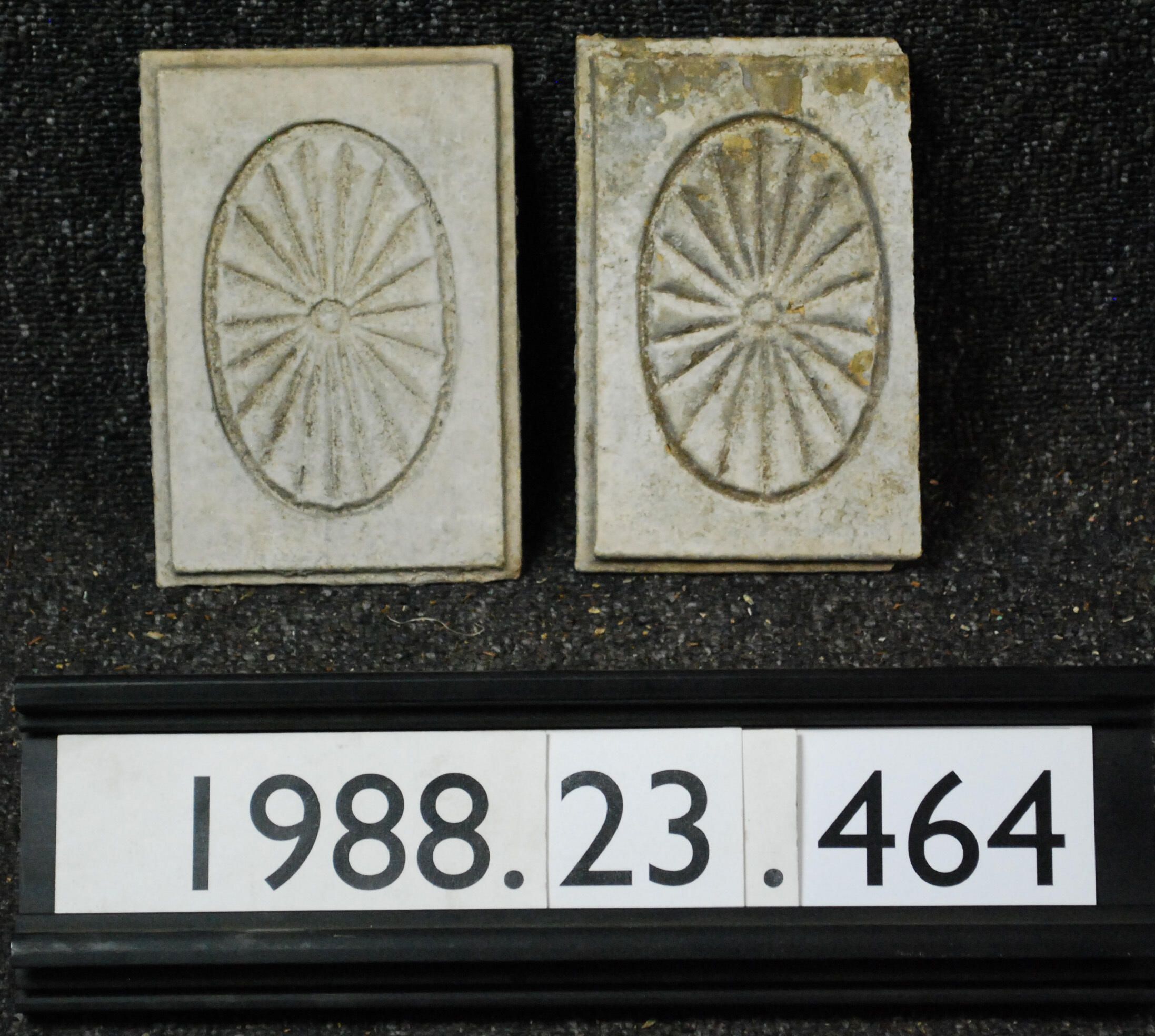 One lot of two exterior wood ornaments. Each is rectangular with centered oval. Carved relief. Sunburst type motif. One complete, the other one with truncated edge. Painted white..