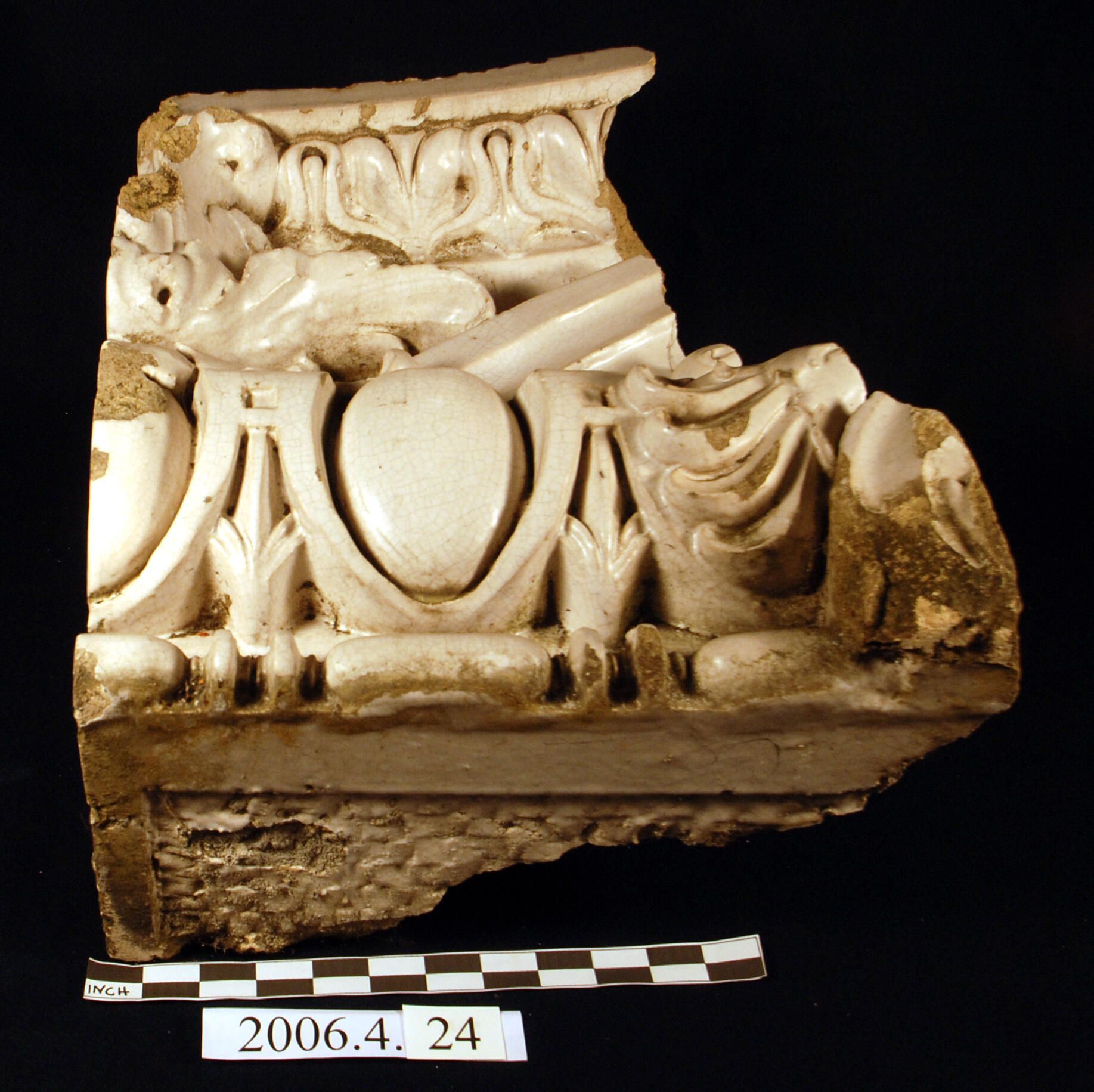 Historic glazed (cream colored) terra cotta. Buff colored fabric. Right side half segment of ionic capital. Carved acanthus. Lamb's tongue foliated motif (partial volute). Egg and dart, and lozenge and reel motifs. Impressed inscription on top edge: 320 A 18 D. Reverse is hollow and has four compartments.