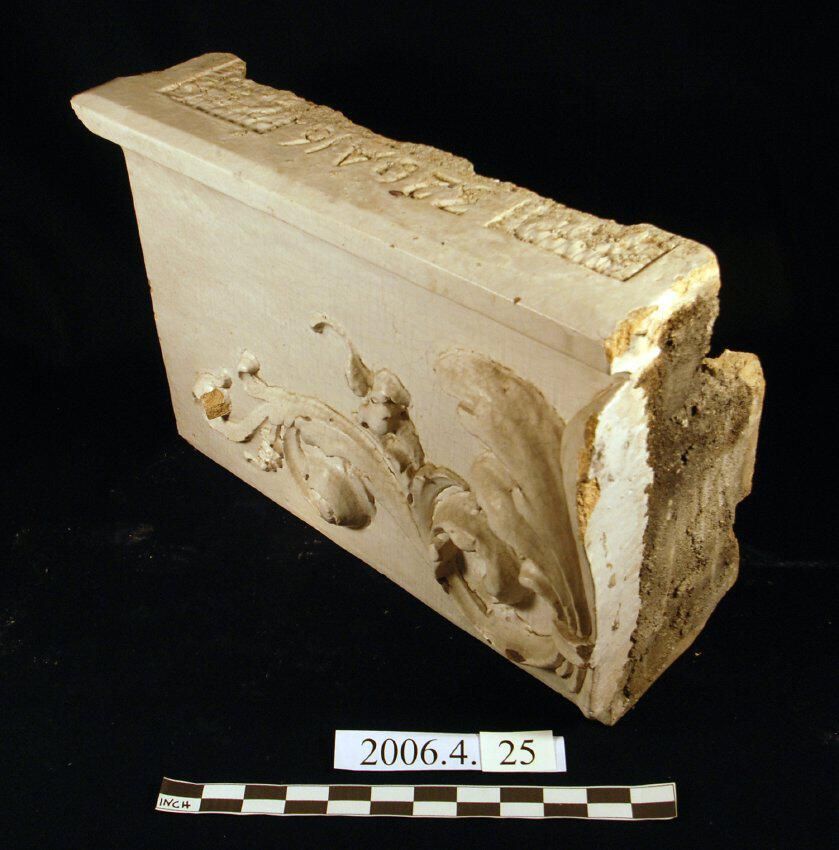 Historic glazed (cream colored) terra cotta. Buff colored fabric. Rectangular block (probably pilaster shaft element). Relief botanical motifs. Reverse is hollow with six compartments. Partially filled with mortar. Top edge has impressed inscription: 320A16.