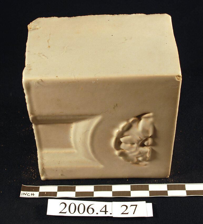 Modern unused glazed terra cotta block. Cream colored glaze. Buff colored fabric. Botanical and recessed Panel motifs. Reverse and end are hollow.