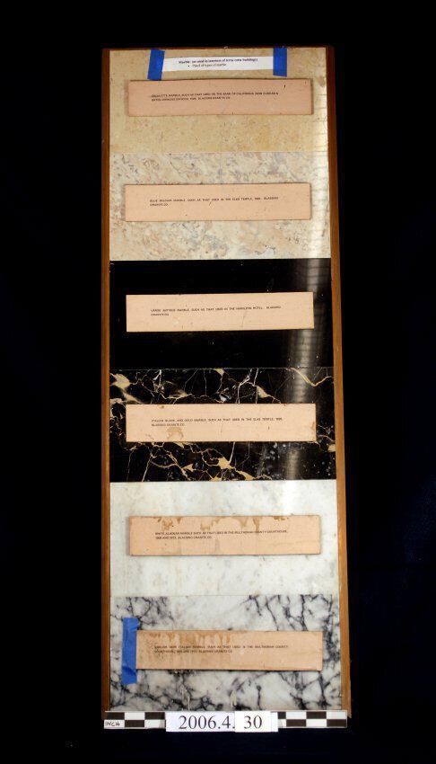 Board with six mounted marble samples. Supplied to Virginia Ferriday by Blaesing Granite Company. Types of marble used on interiors of terra cotta buildings.