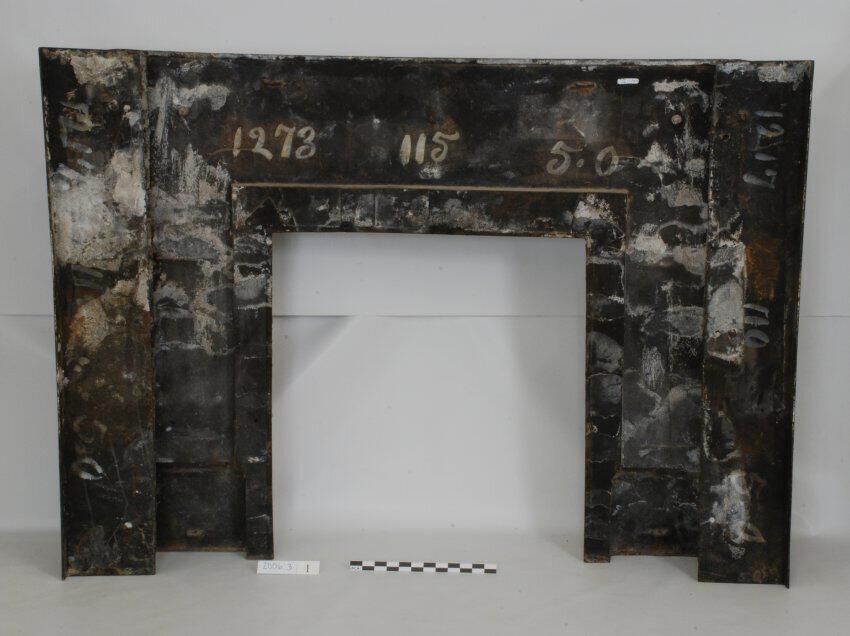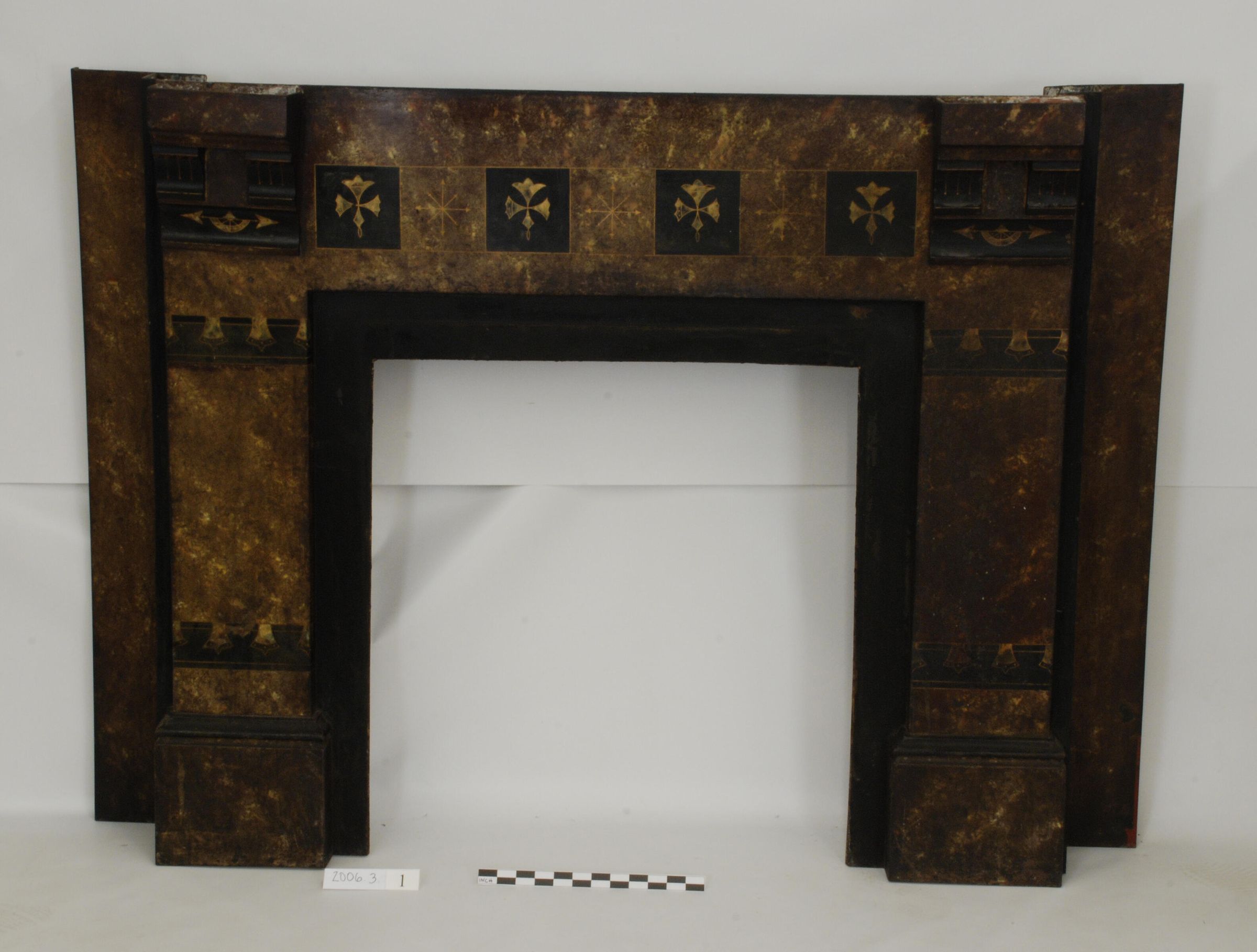 Cast iron. Faux marbleized. Yellowish brown polychromed black and gilded. Botanical and Geometrical decorations. Pilasters with brackets on front composed of components bolted together. Has slate mantel shelf.
