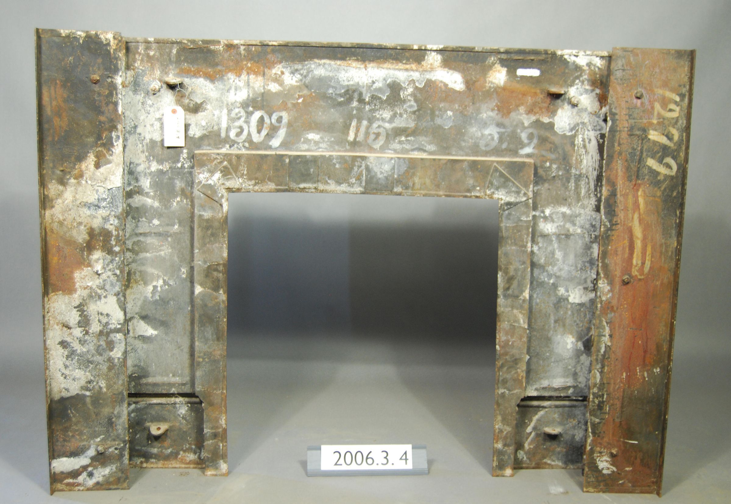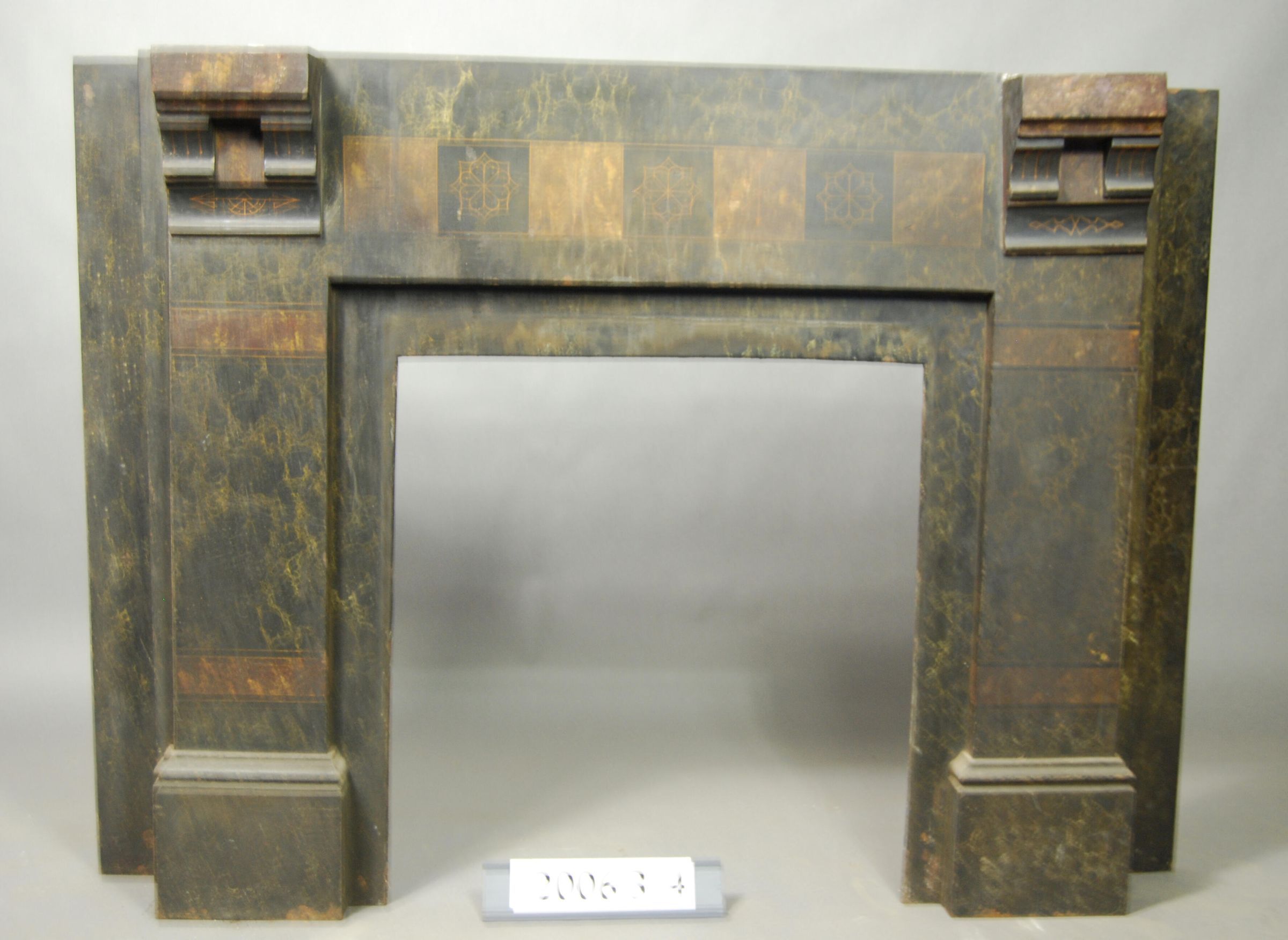 Cast iron. Black / brown faux marbleized lintel and pilasters. Cast in one piece. Brackets bolted on at top of each pilaster. Gilded geometrical decoration on brackets. Lintel and pilasters. Angled pieces bolted at each side of mantel.