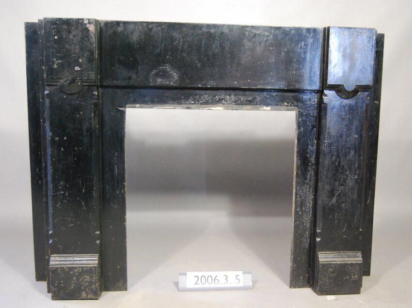 Cast iron. Originally faux marbleized, later painted over with gloss black. Composed of lintel and pilasters bolted together. Molded cap block and plith base blocks bolted-on. Angled pieces bolted at each side of mantel.