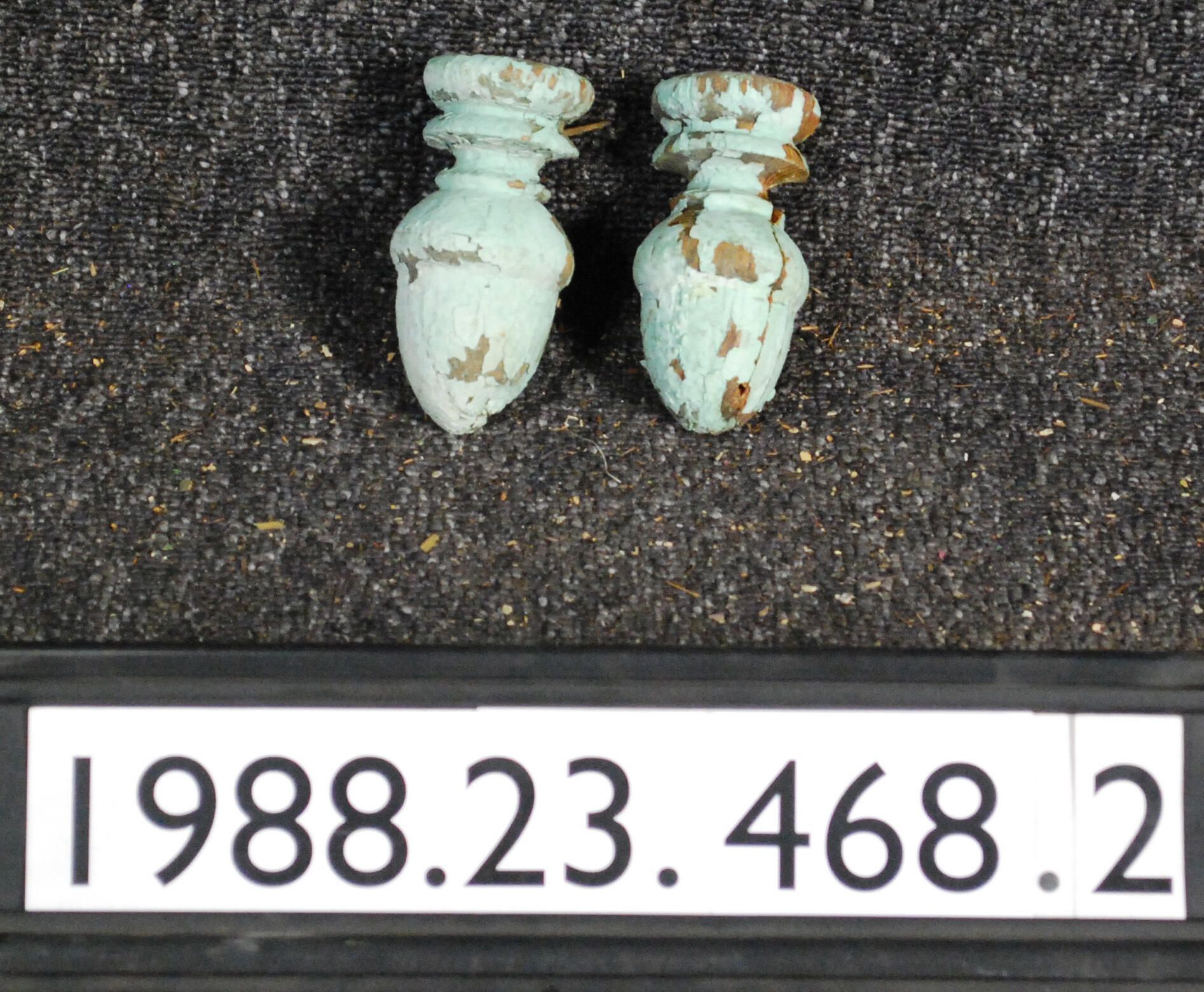 One lot of two turned exterior wood drop ornaments. Each is notched on reverse. Painted green.
