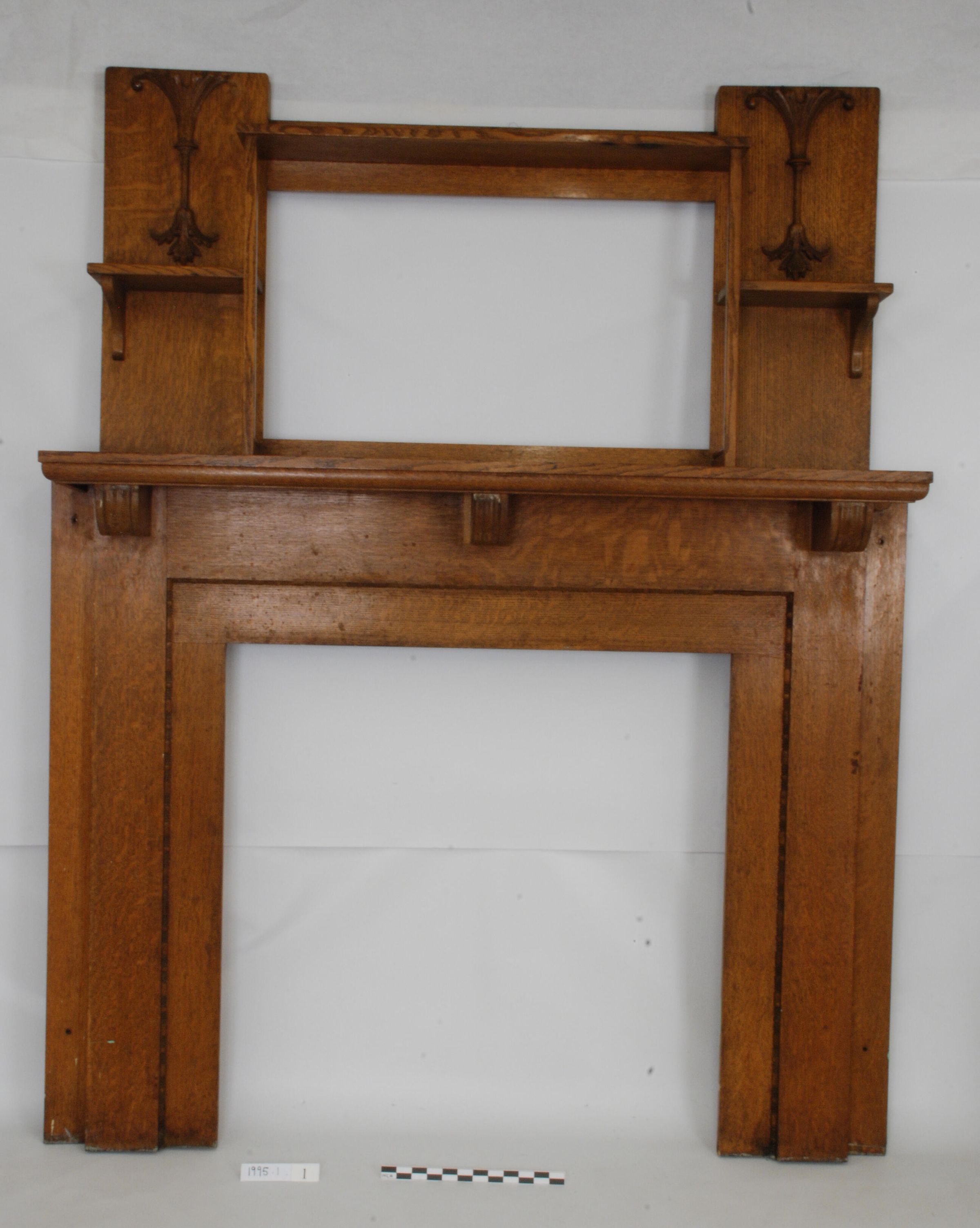 Oak Over Mantel with central frame for mirror (mirror broken and removed and placed in storage). Shelf above and shelf and bracket mounted on panels on each side has applied foliated carvings. Mantel shelf supported by three brackets. Has ovolo molding under shelf. (Piece missing).
