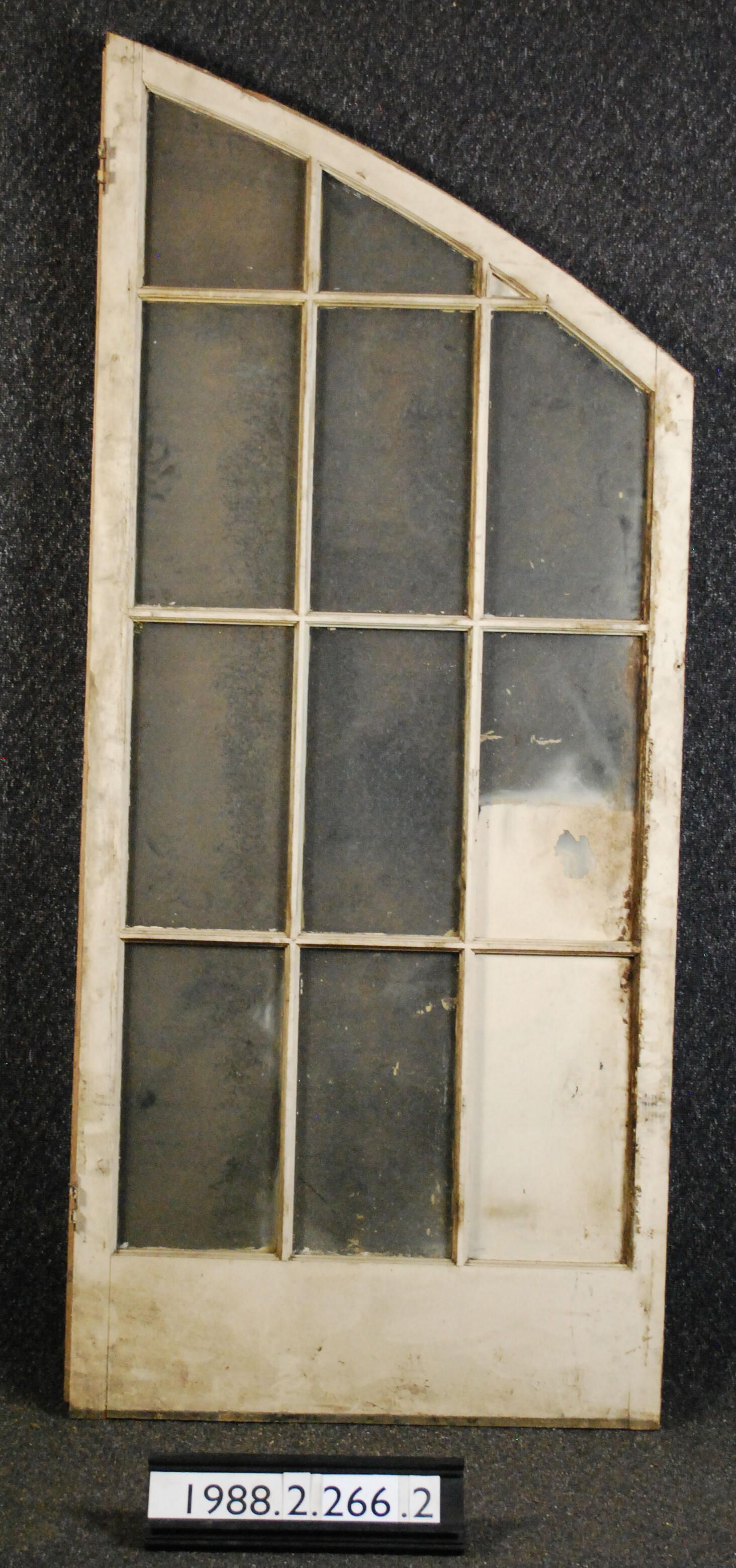 Exterior fixed sash. Curved top. Twelve openings with clear glass panes. Associated with door 1988.2.266 - 1988.2.266.1. Painted pink on exterior side and beige on interior side.