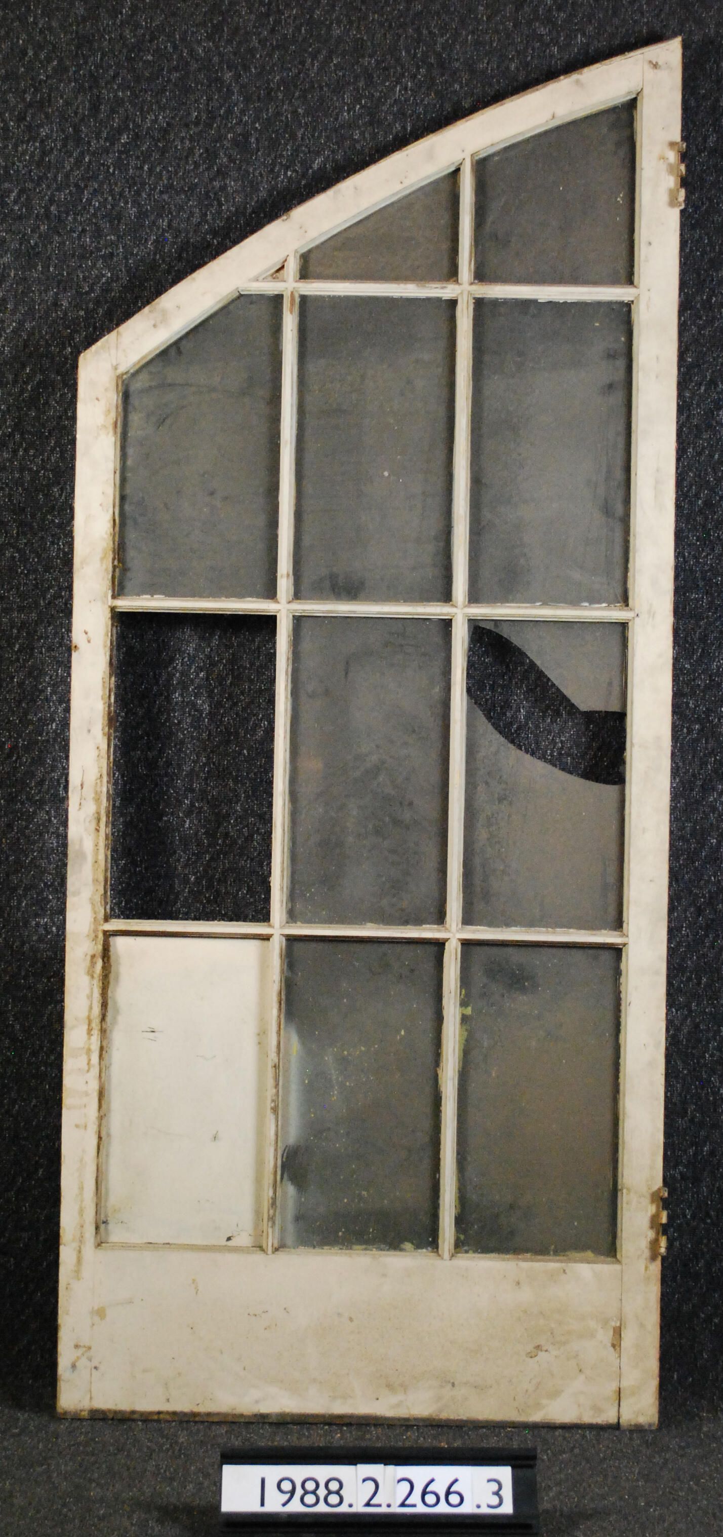 Exterior fixed sash. Twelve openings with clear glass panes. Associated with door 1988.2.266 - 1988.2.266.1. Painted pink on exterior side and beige on interior side.
