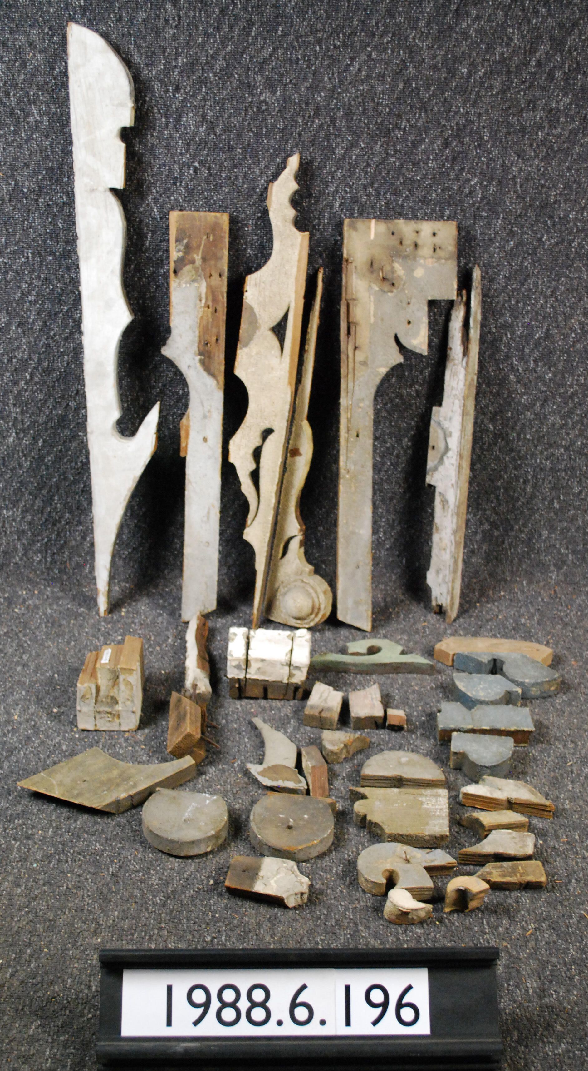 One lot of approximately thirty-three fragments of wood. Fret-cut and truncated edges / ends. Most are bracket parts which could possibly cross-mend with brackets in BMF Collection. Multiple undetermined origins. May include parts from other artifact categories. Remnants of paint.