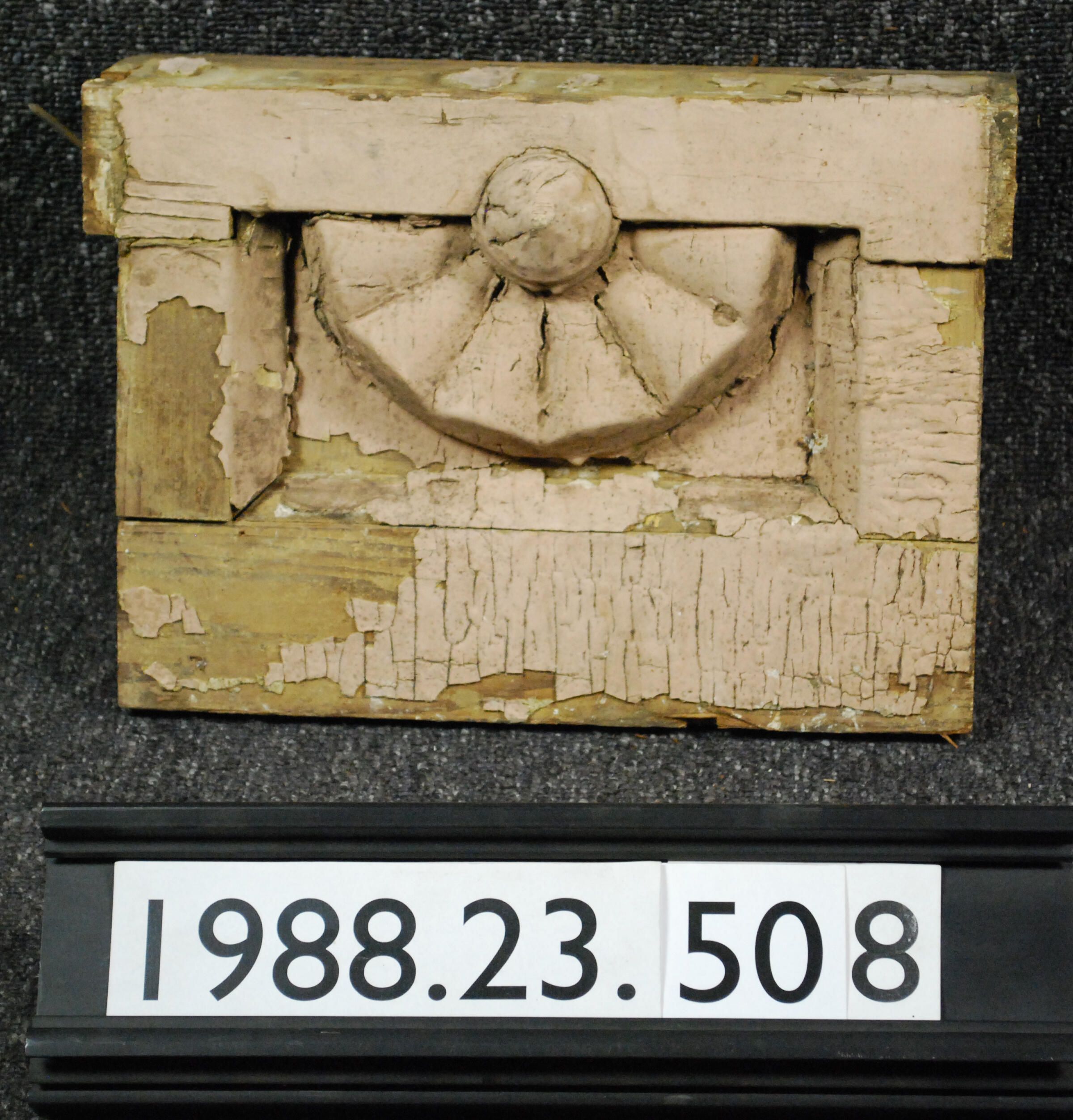 Rectangular ornament. Built-up from molding parts. Has recessed panel with sunburst (or half rosette) carved motif. Painted pink.