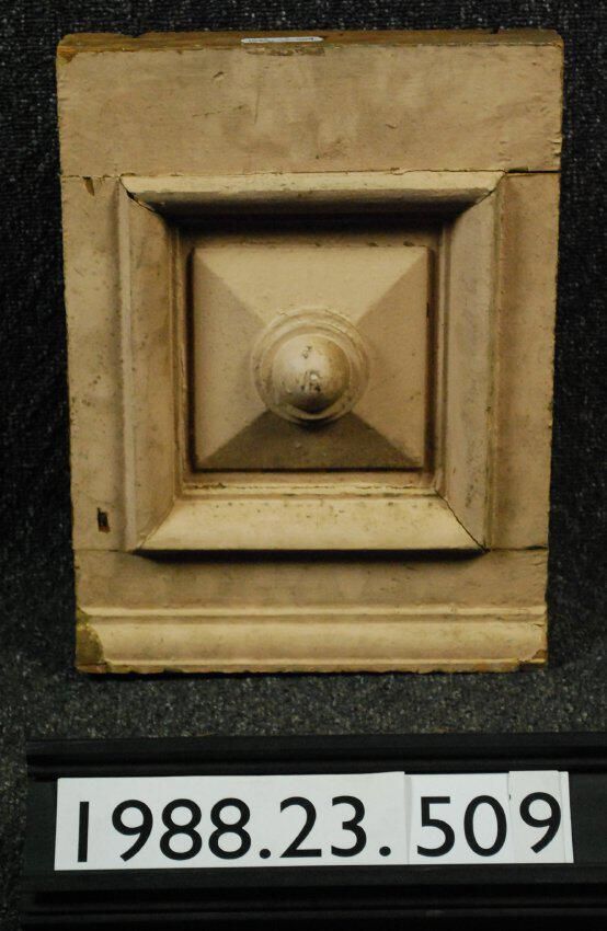 Rectangular panel. Applied moldings. Some moldings missing central bulls eye on both sides. Painted pink / yellow. Manufacturer: Place of Manufacturer: Design motif: Style: Finish: Painted Pink / Yellow