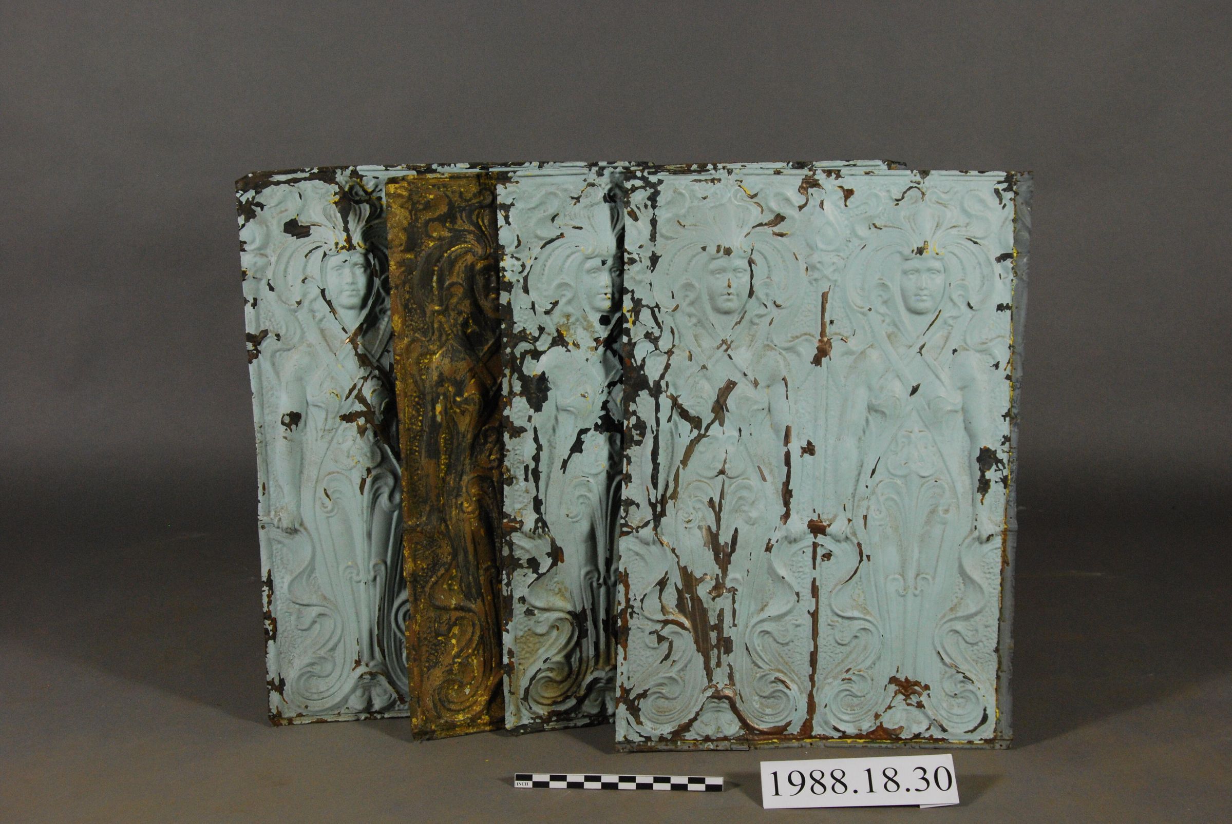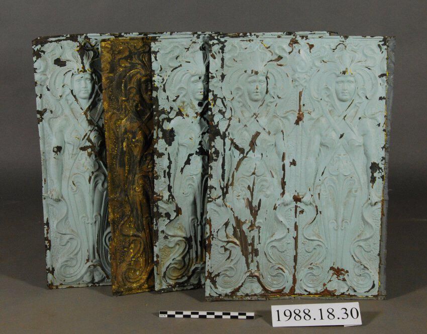 One lot of five die-stamped rectangular sheet iron / steel ceiling panels with elaborate Relief Stylized Dual Anthropormorphic Female Figures surrounded by Scrolled Headdress and Scrolled Drapery. Three panels painted blue. Two panels stripped.