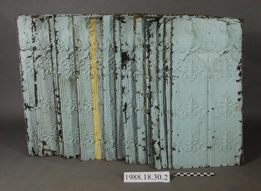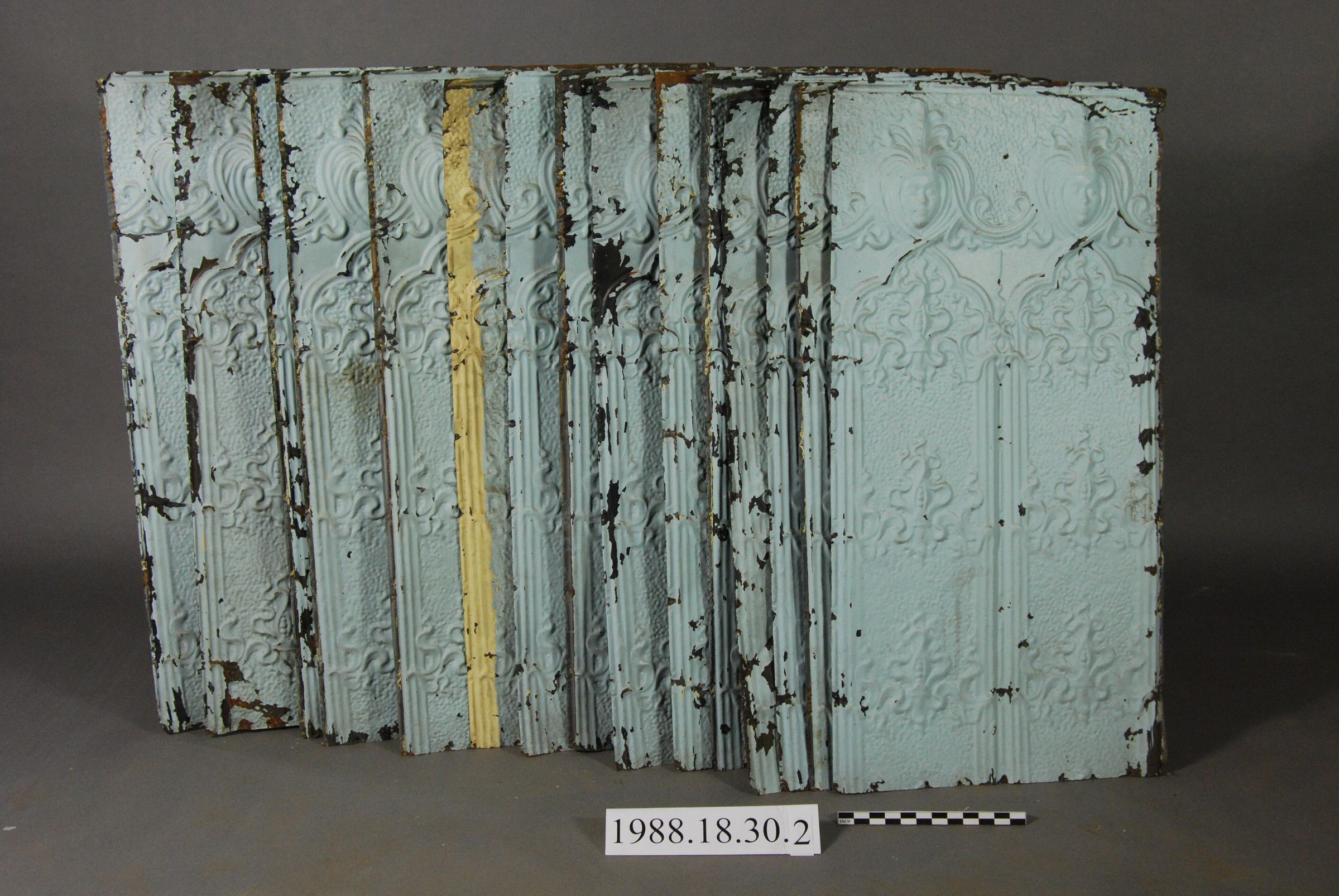 One lot of fifteen die-stamped rectangular sheet iron / steel ceiling panels with elaborate Relief Stylized dual Anthropomorphic Female Figure Heads surrounded by scrolled headdress, below which is Motif with Gothic Style Arches and Scroll and Rectilinear Bands. Painted blue.