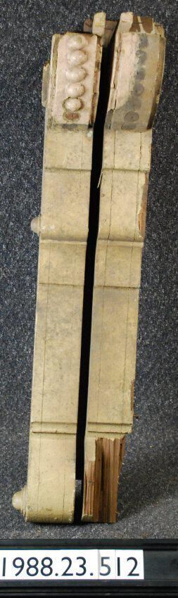 Exterior wood, corbel (bracket) with compound contour. Built-up twin components. Parts missing. Truncated top. Painted pink / yellow. Manufacturer: Place of Manufacturer: Design motif: Quatrefoil Motif Rosette Style: Finish: Painted Pink