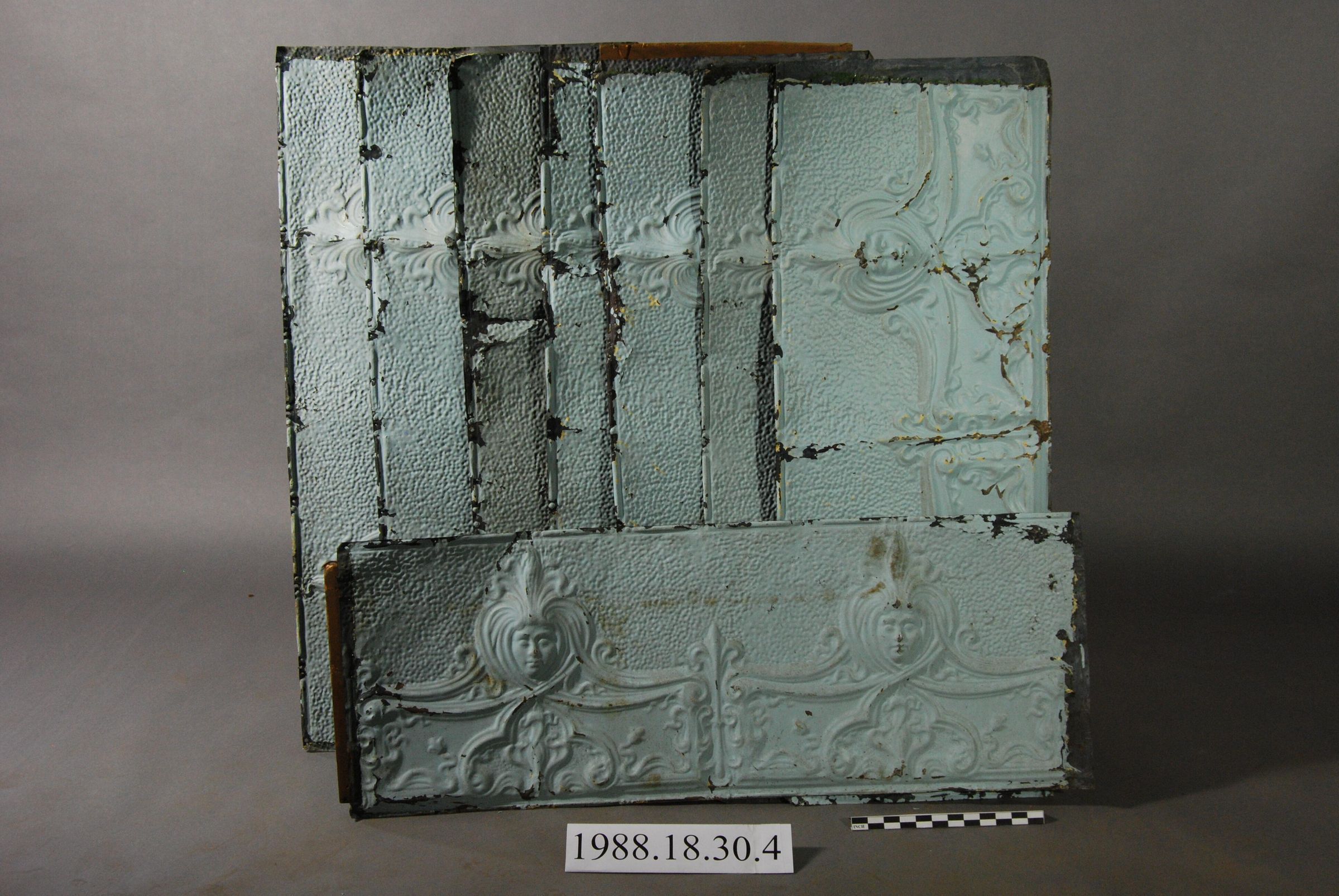 One lot of eight die-stamped rectangular sheet iron / steel ceiling panels with elaborate Relief Stylized Female Figure Heads surrounded by scrolled headdress, below which is Motif with Gothic Style Arches. Painted blue. (One piece has corner cut out ).