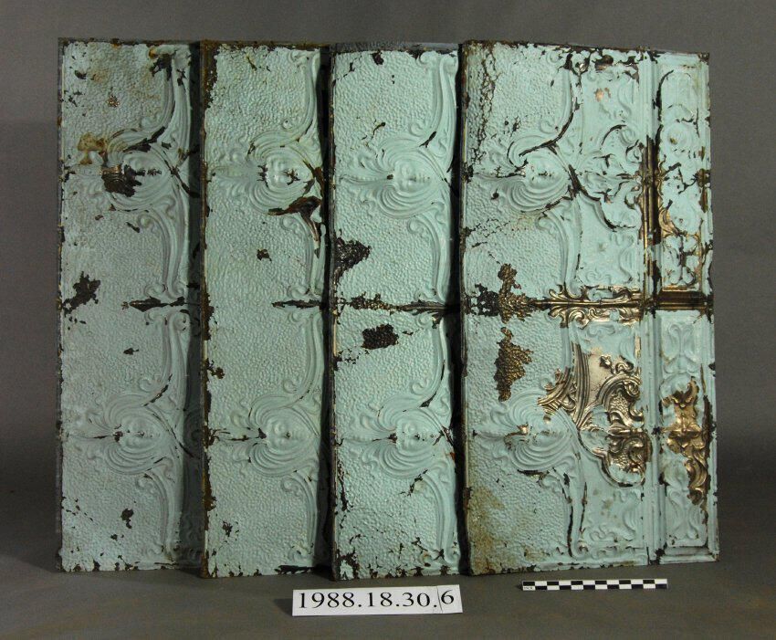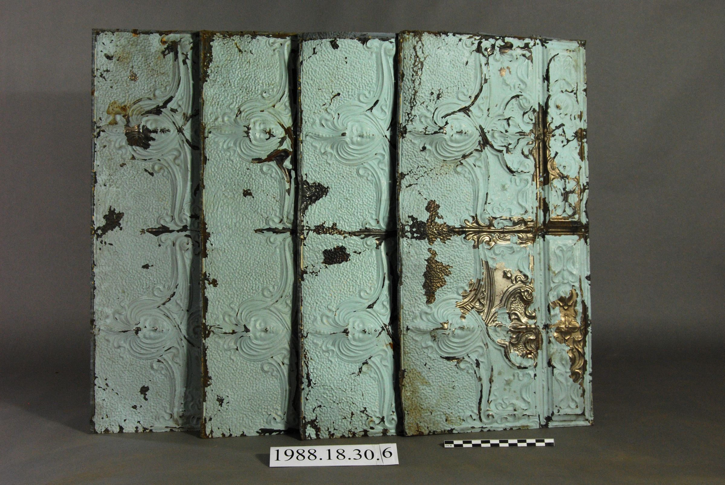 One lot of four die-stamped rectangular sheet iron / steel ceiling panels with elaborate Relief Stylized Dual Female Figure Heads surrounded by scrolled headdress, below which is Motif with Gothic Arches, below which is rectangular panel. Painted blue.