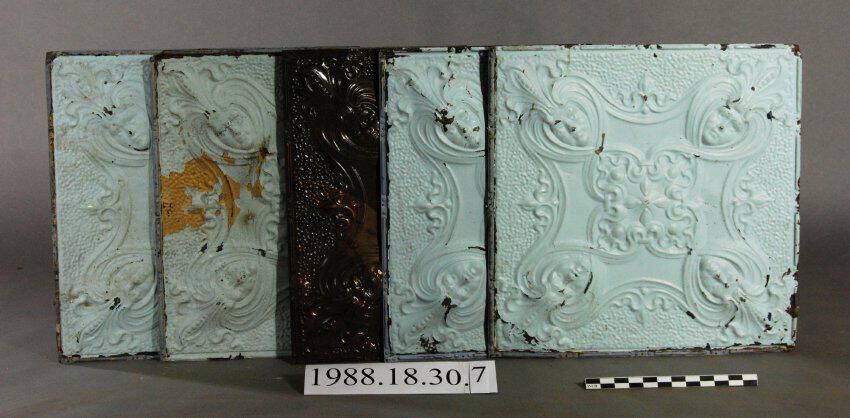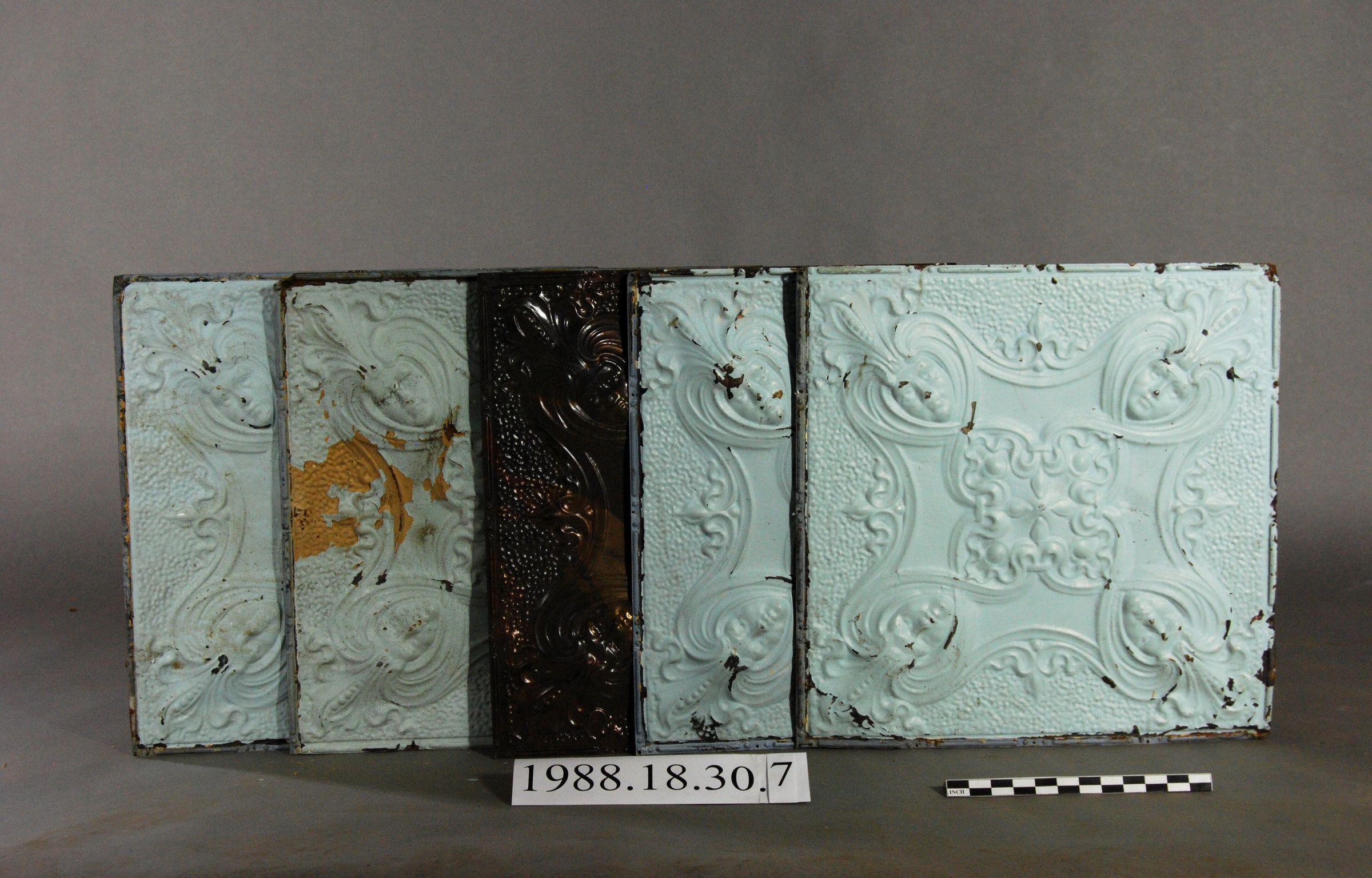 One lot of five square die-stamped sheet iron / steel ceiling panels with elaborate relief stylized female figure heads (one in each of the four corners) surrounded by scrolled headdress. Rosette at center. Painted blue. One panel is stripped.