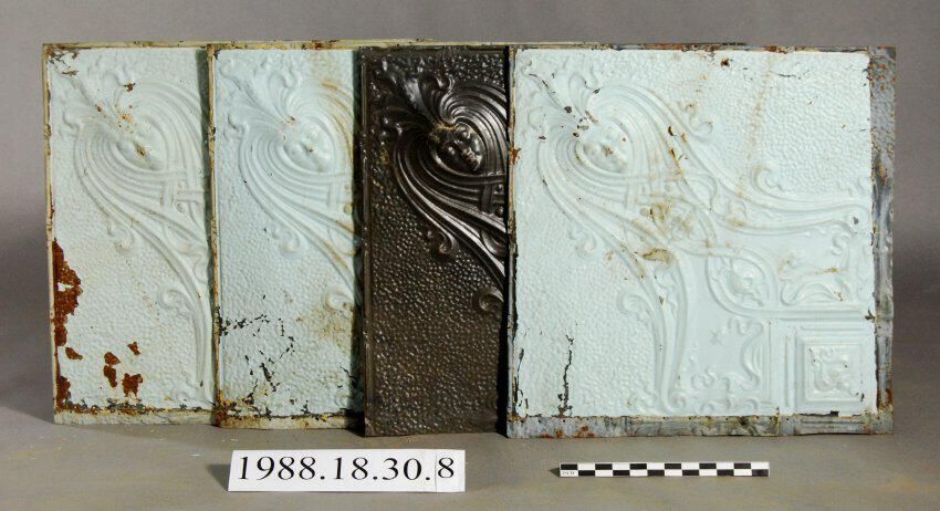 One lot of four square die-stamped sheet iron / steel ceiling panels with elaborate relief stylized female figure head surrounded by scrolled headdress, below which is panel with scrolled ornament. Painted blue. One piece is stripped.