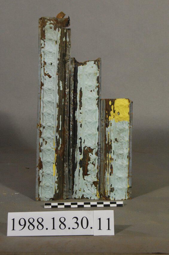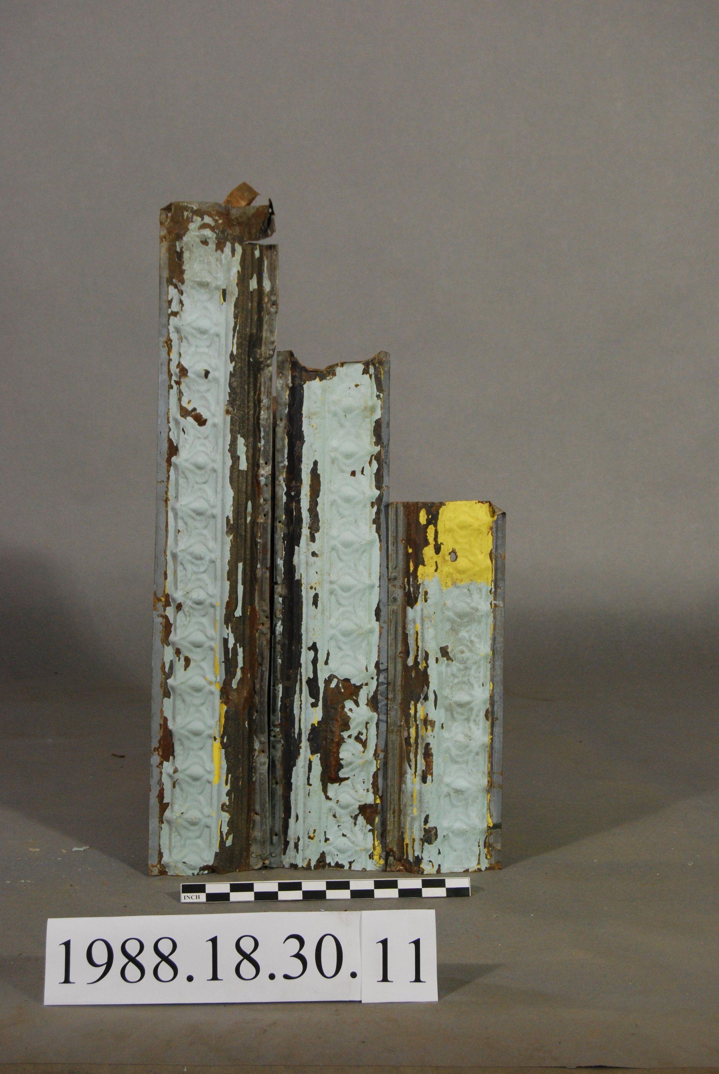 One lot of three die-stamped sheet iron / steel ceiling edging strips with Egg and Dart variation Motifs. Painted blue and remnants of yellow..