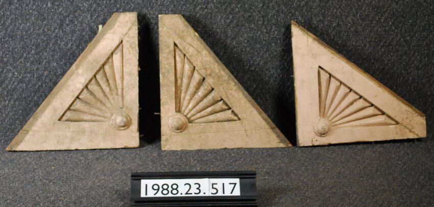 One lot of three exterior wood ornaments. Triangular. Each has recessed panel with fan ornament and bullseye. One has dry rot at reverse side. Painted pink.