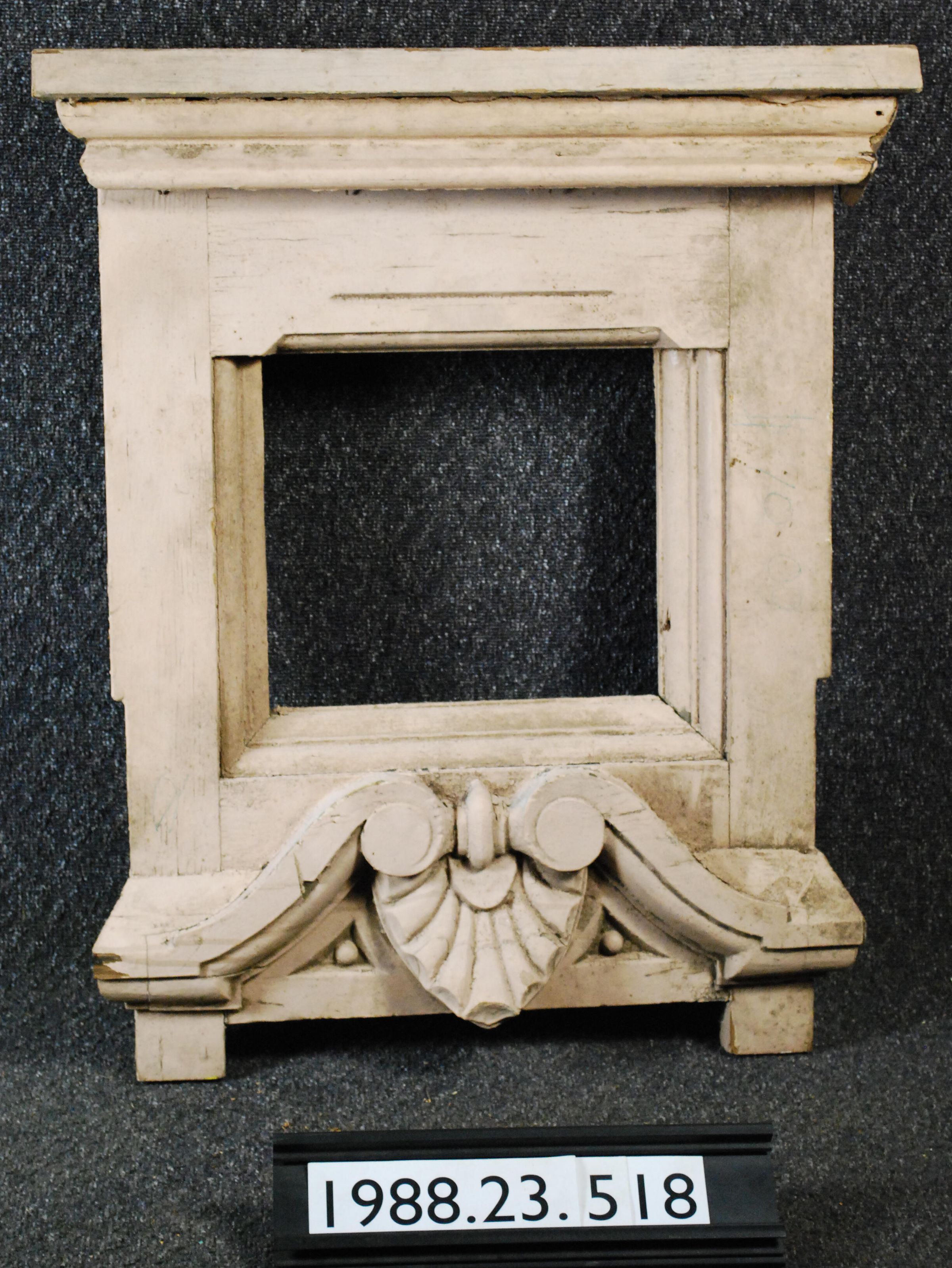 Exterior wood trim. Built-up from multiple components. Rectangular frame. Recessed opening (possibly for panel or window opening). Has carved scrolled ornament at lower rail. Includes detached drip board at top. Painted pink. Matches 1988.23.518.1.