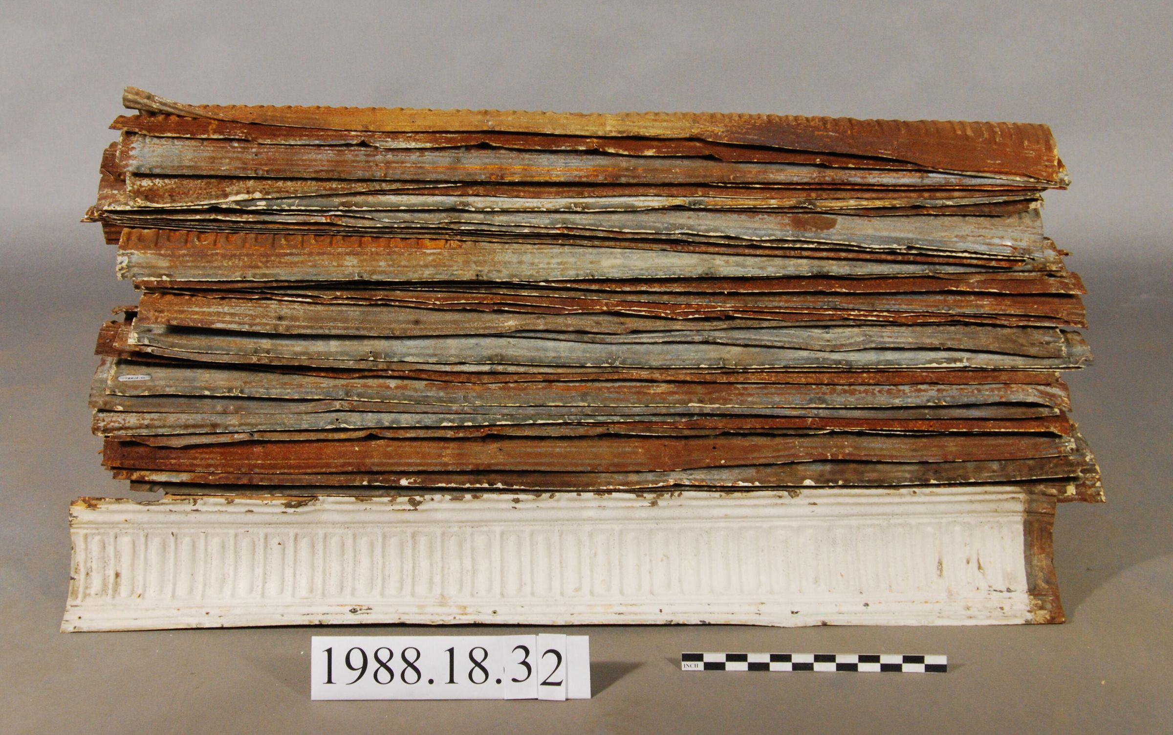 One lot of three die-stamped sheet iron / steel ceiling cornice segments with vertical fluting. Painted white. Note: 37 deaccessioned in 2017.