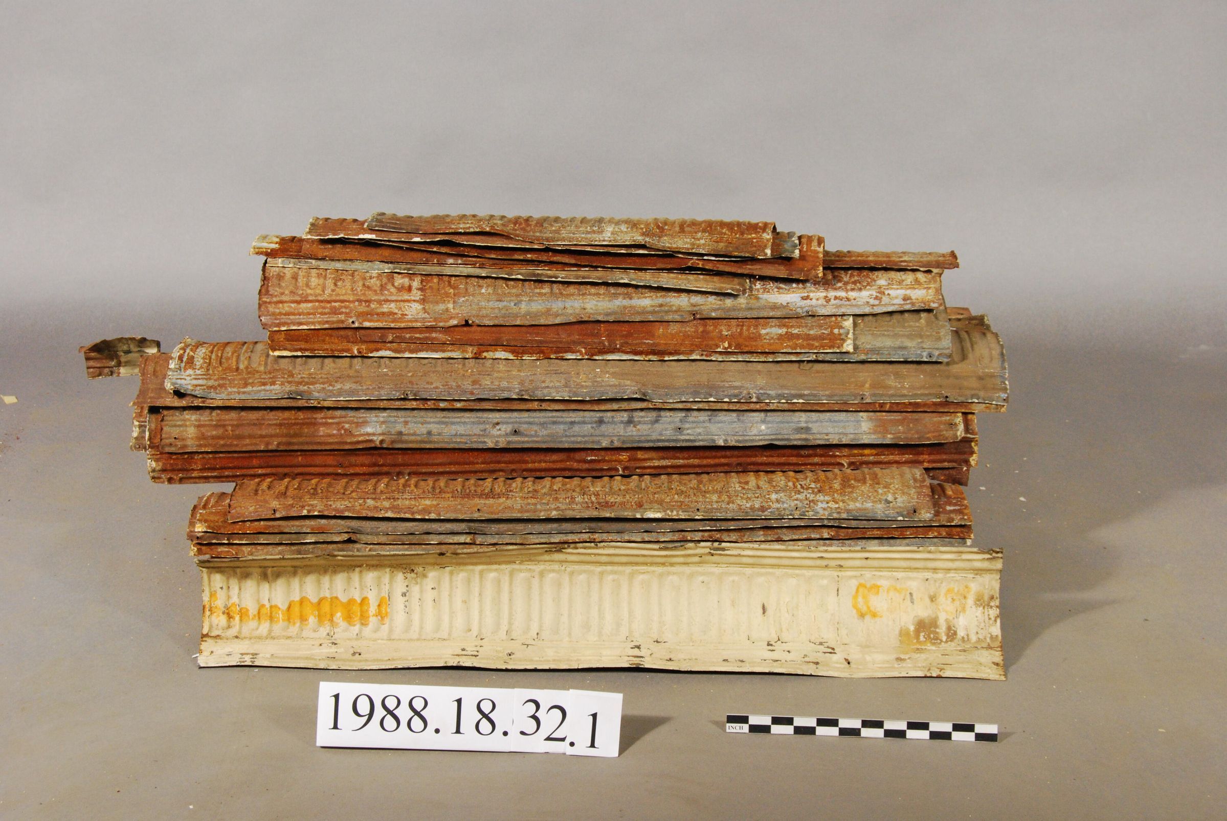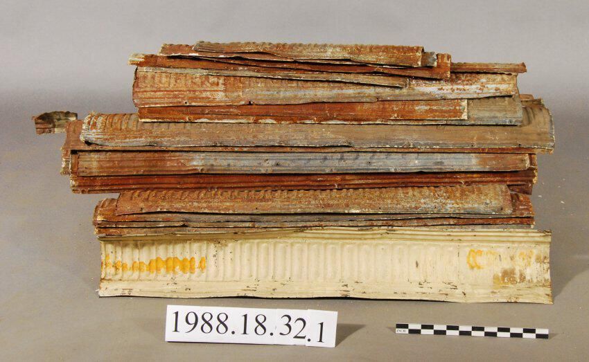 One lot of twenty die-stamped sheet iron / steel ceiling cornice segments with vertical fluting. Painted white or off-white / yellow.