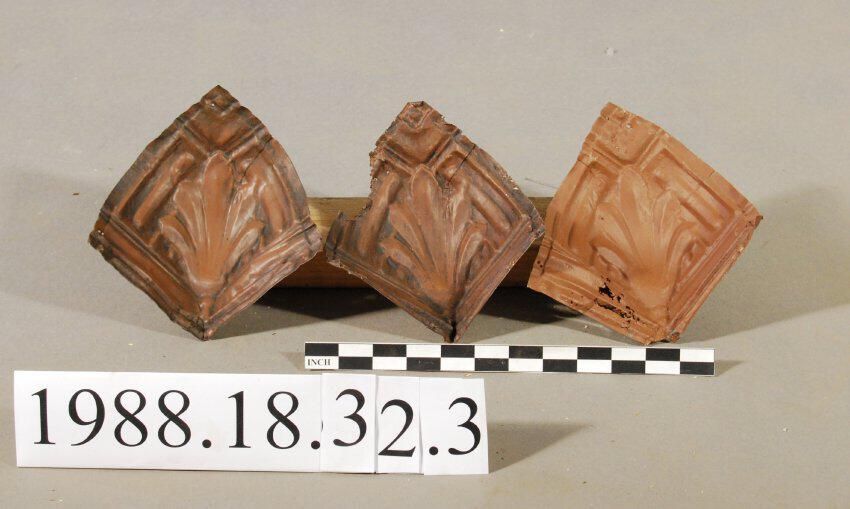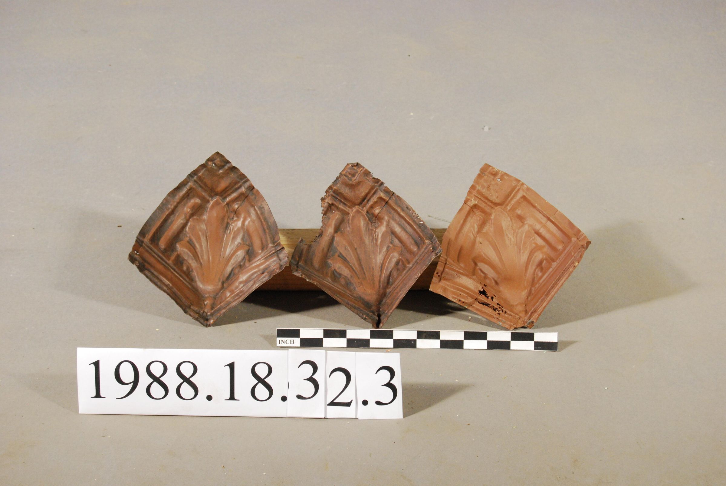 Die-stamped sheet iron / steel ceiling cornice interior corner segment with palmette and vertical fluting. Painted brown. Note; 2 deaccessioned in 2017.