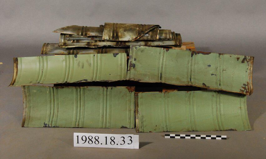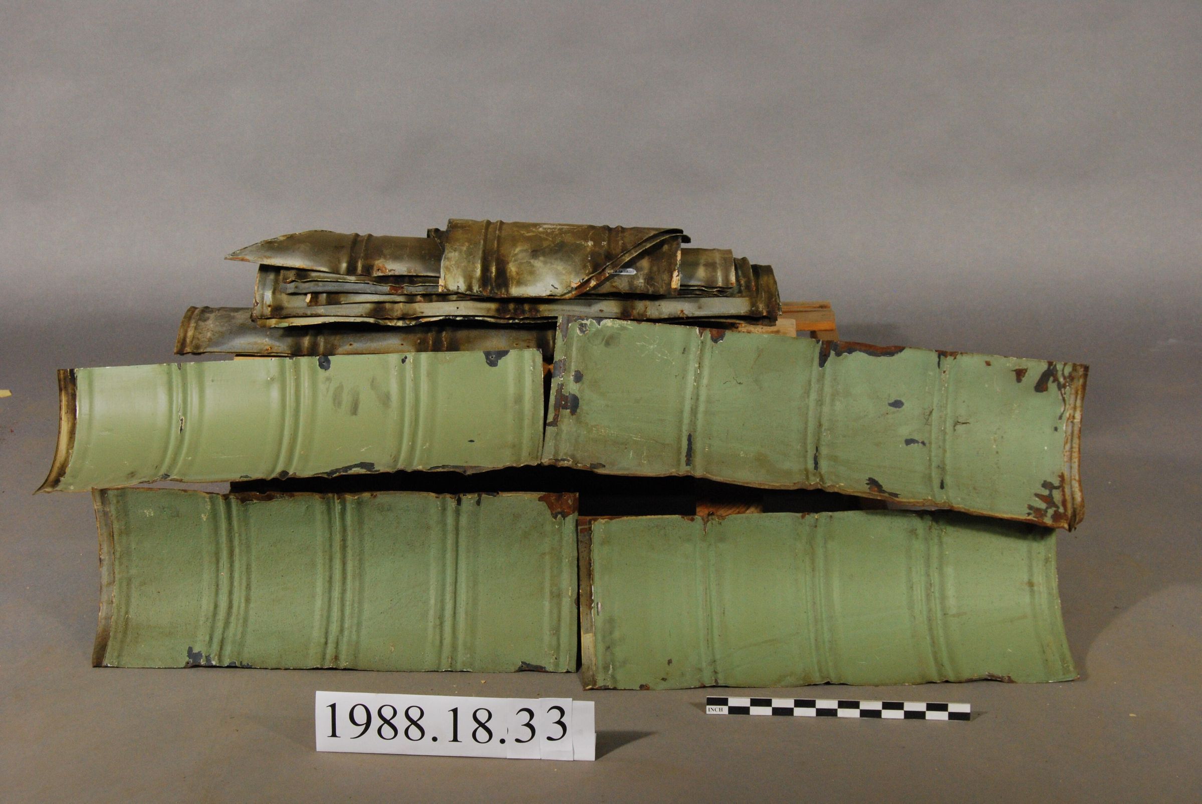 Die-stamped sheet iron / steel ceiling cornice segment. Simple cove with equi-distant vertical ridges. Painted green.