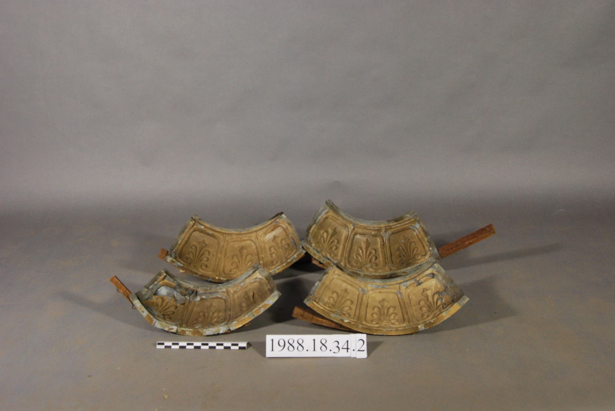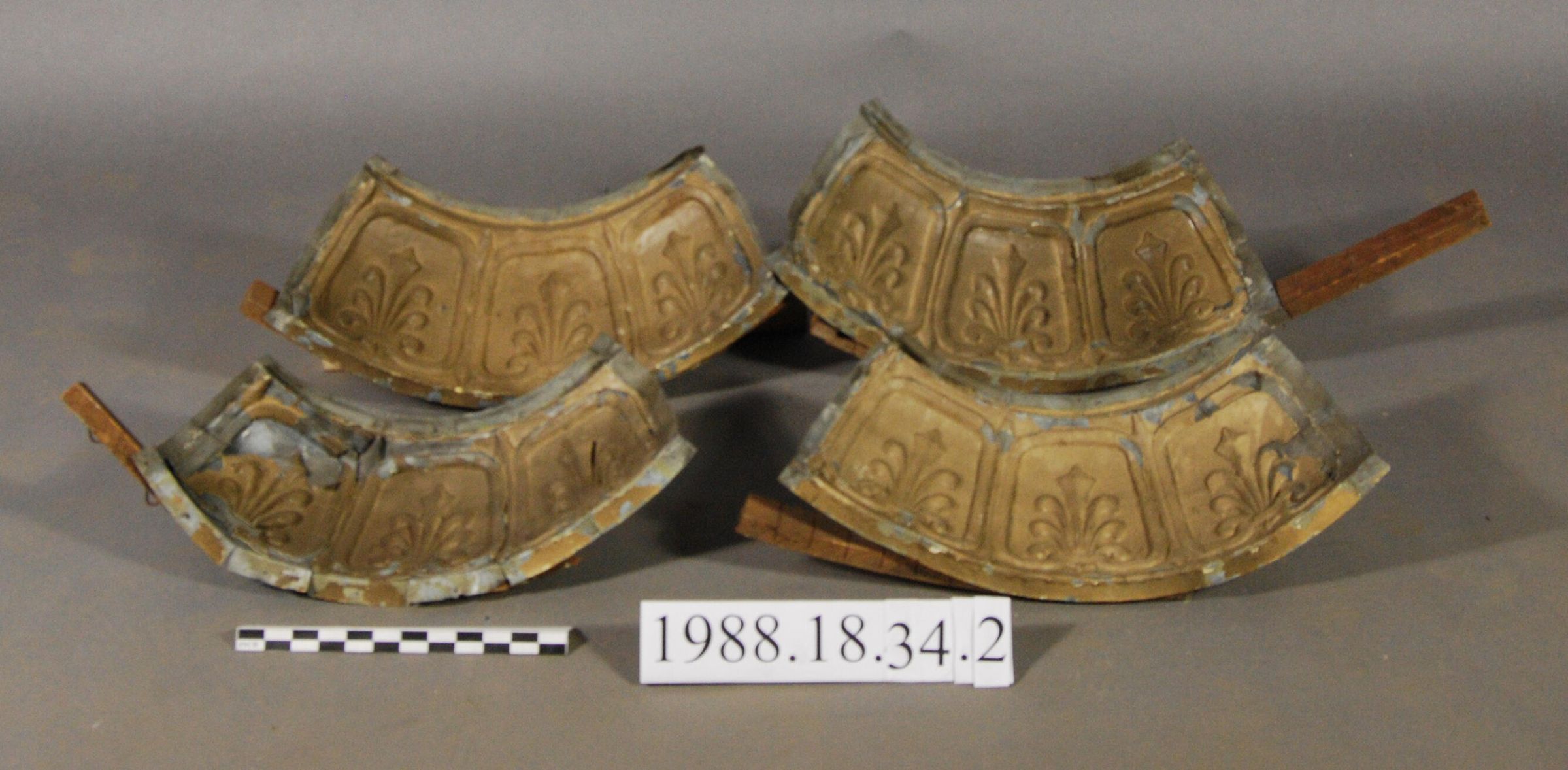 One lot of four die-stamped sheet iron / steel ceiling cornice inside corner curved segments. Compound molding with Palmette Motifs. Painted tan. Each segment has wood backing strip. Measurement does not include wood. One segment has inscription which implies provenance.