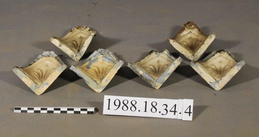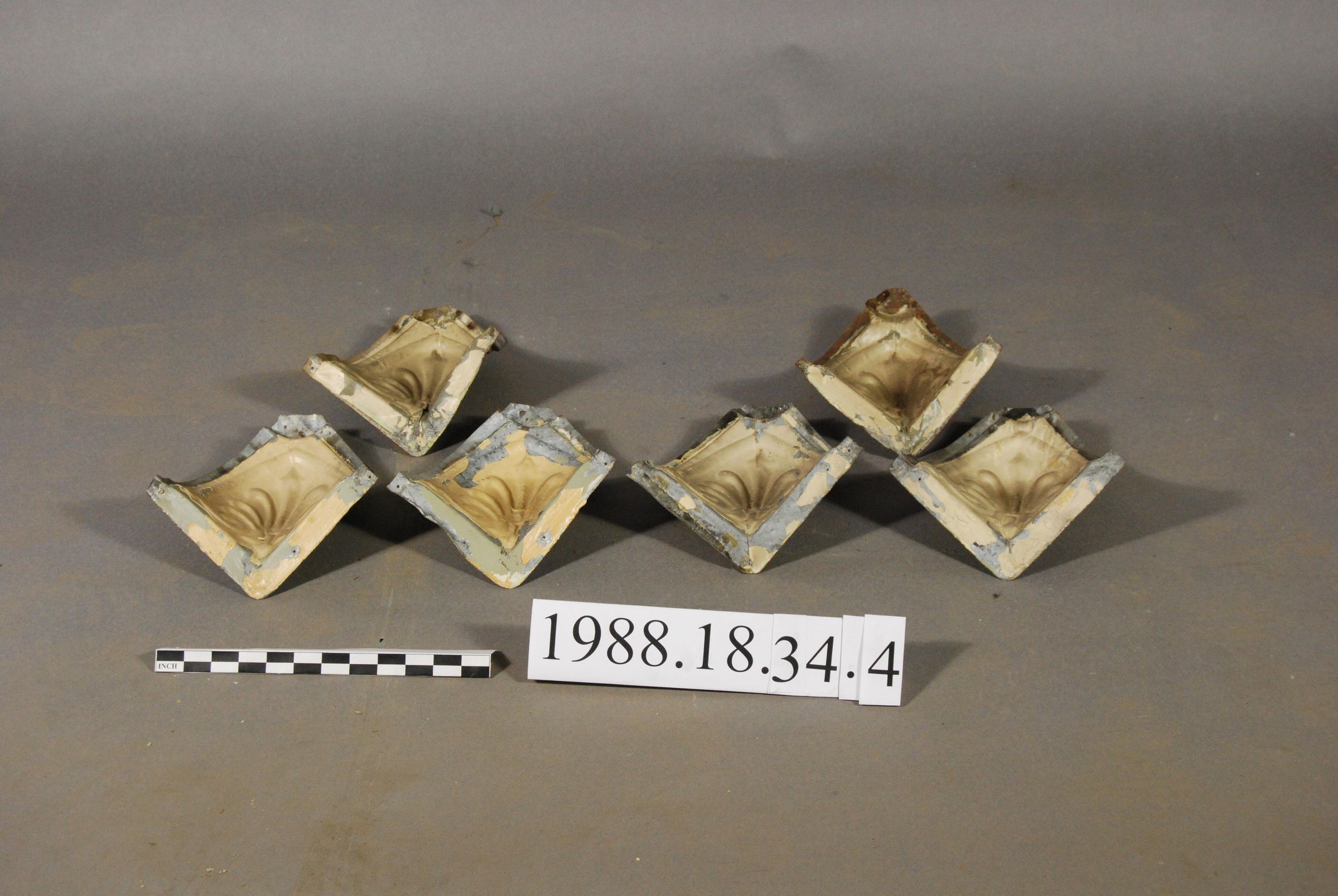 One lot of six die-stamped sheet iron / steel ceiling cornice inside corner segments. Compound molding with Palmette Motif. Painted tan.