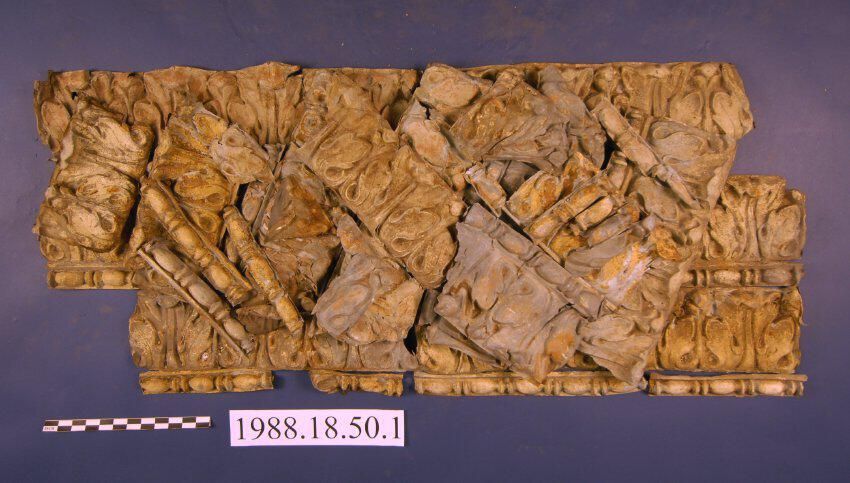 One lot of thirty-one die-stamped zinc sheet metal cornice molding segments and fragments with Acanthus and / or Disc and Lozenge Bead Motifs. Remnants of painted surface. Lot includes fragments not cross-mended.