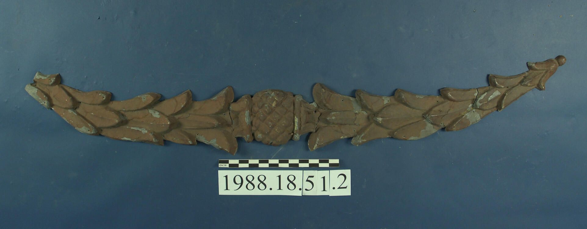 Die-stamped zinc sheet metal ornament with central Pineapple Motif and swag or garland at each end. Composed of multiple segments soldered together. Painted dark reddish-brown. Tip of one end is missing.
