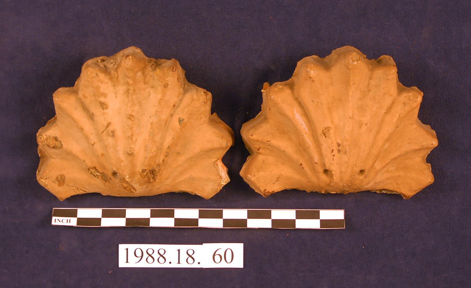 One lot of two cast zinc building facade ornaments Scalloped botanical motif. Painted brown, hollow back. Originally mounted with solder.