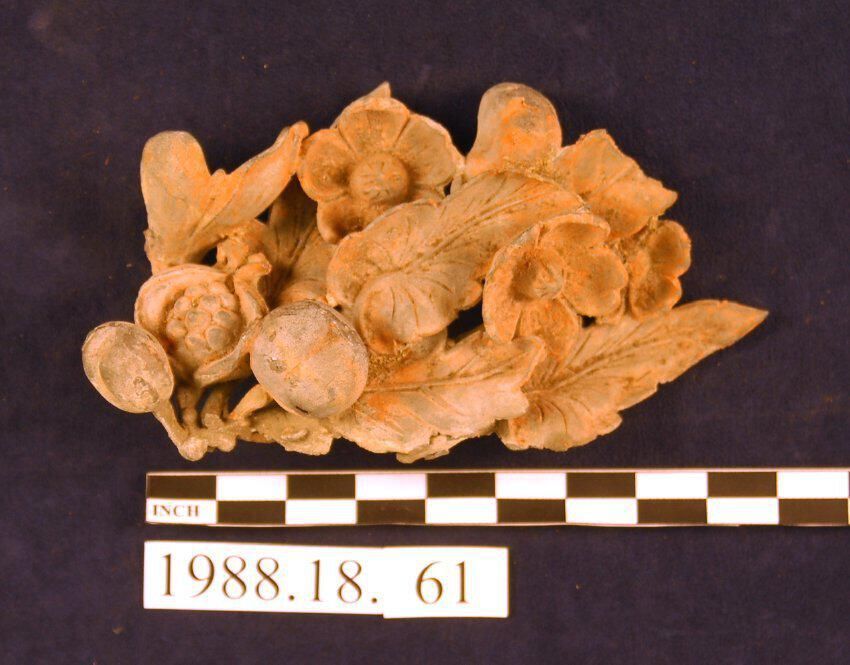 Cast zinc or lead alloy. Botanical Motif with leaf, sprig, bud and floral decoration. Formed from multiple components with scalloped connections. Possibly originally attached to building facade or sculpture.