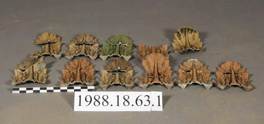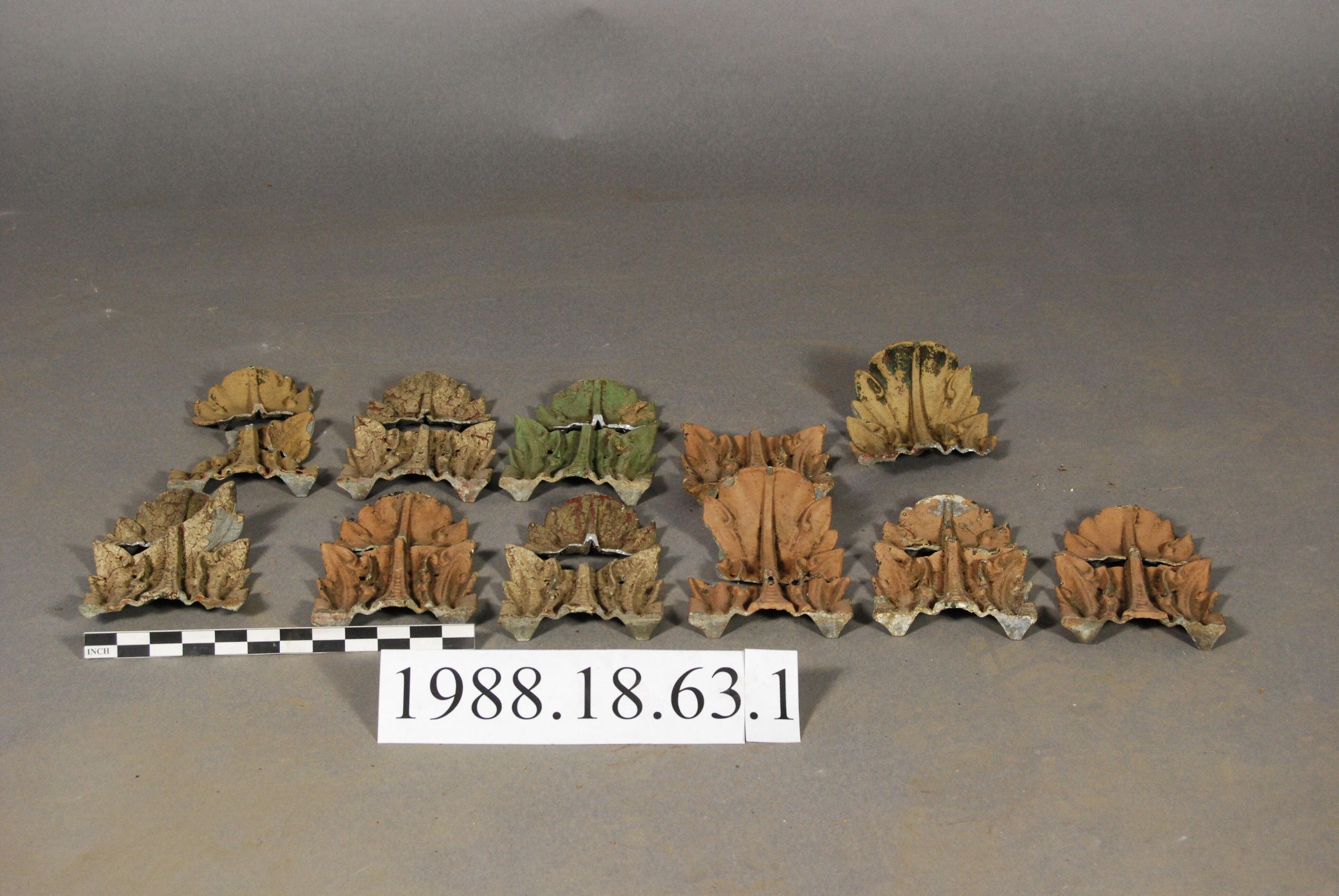 One lot of twelve cast zinc Ornament fragments. Acanthus Leaf Motif. Painted green or cream / rose. Possibly part of cornice. If restored would compose nine nearly complete Ornaments.