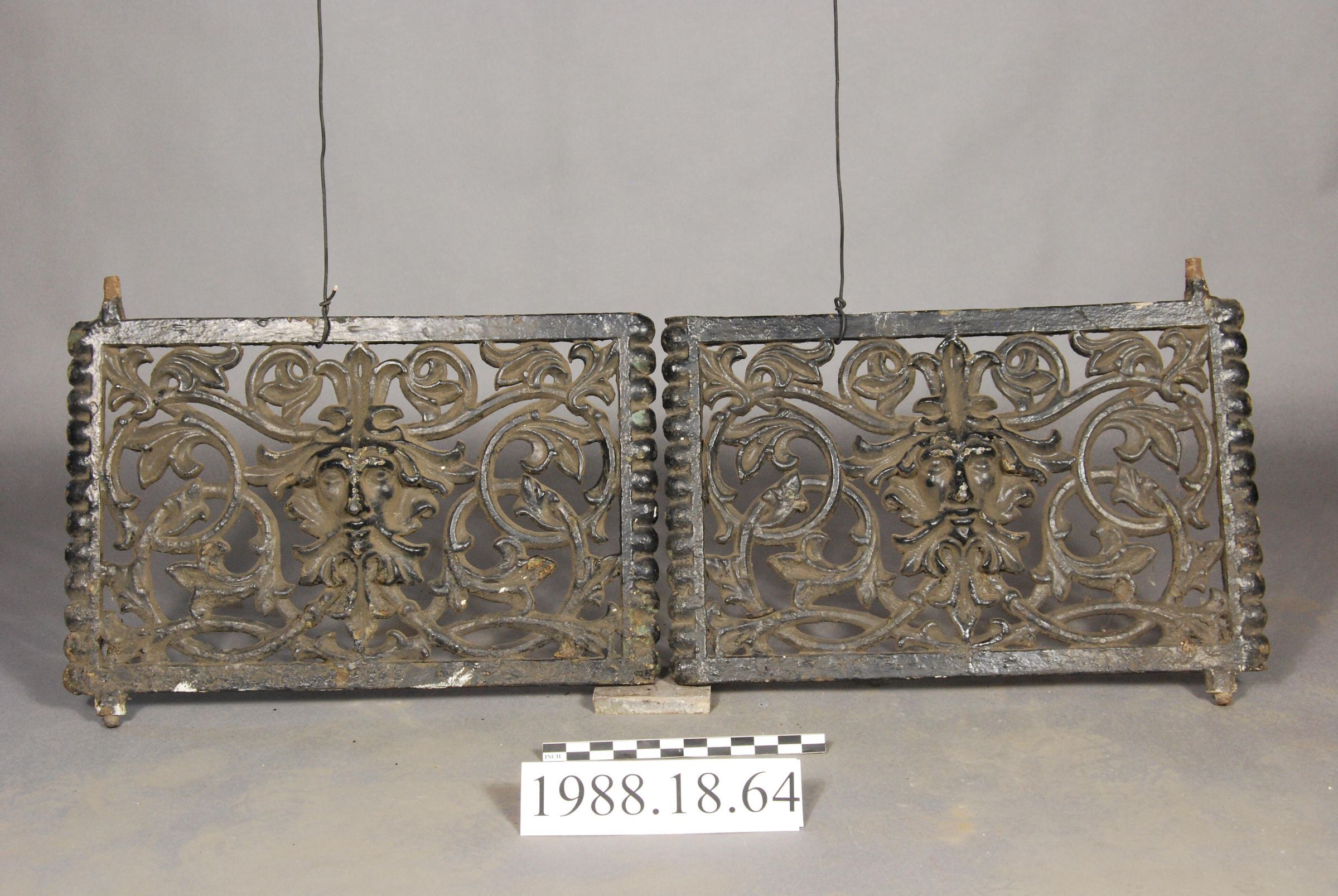 Galvanized sheet iron / steel. Possible Cornice or Building Facade component. Compound curved profile. Fluted center. Multiple sections. Originally soldered together. Some sections detached. Other sections missing. Has cast zinc Ornament (attached with wire) with Leaf / Scroll / Botanical Bud and Bead Motif. Remnants of paint.