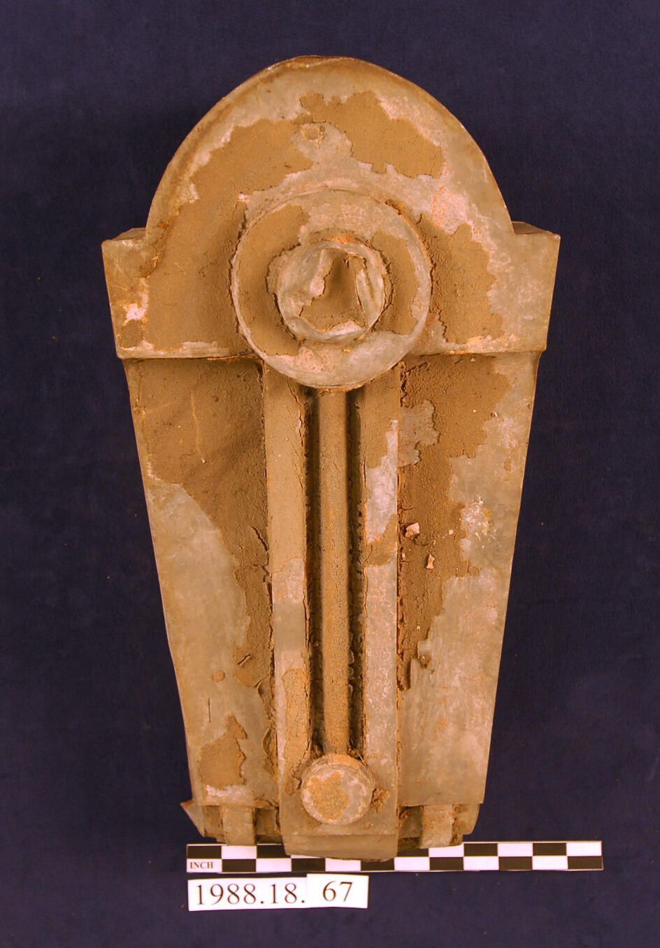 Galvanized sheet iron / steel building facade component in shape of Keystone. Multiple parts soldered together. Arched top. Circular medallion with half-dome ornament. Vertical fluting. Curved corner end with banded decoration. Remnants of paint.