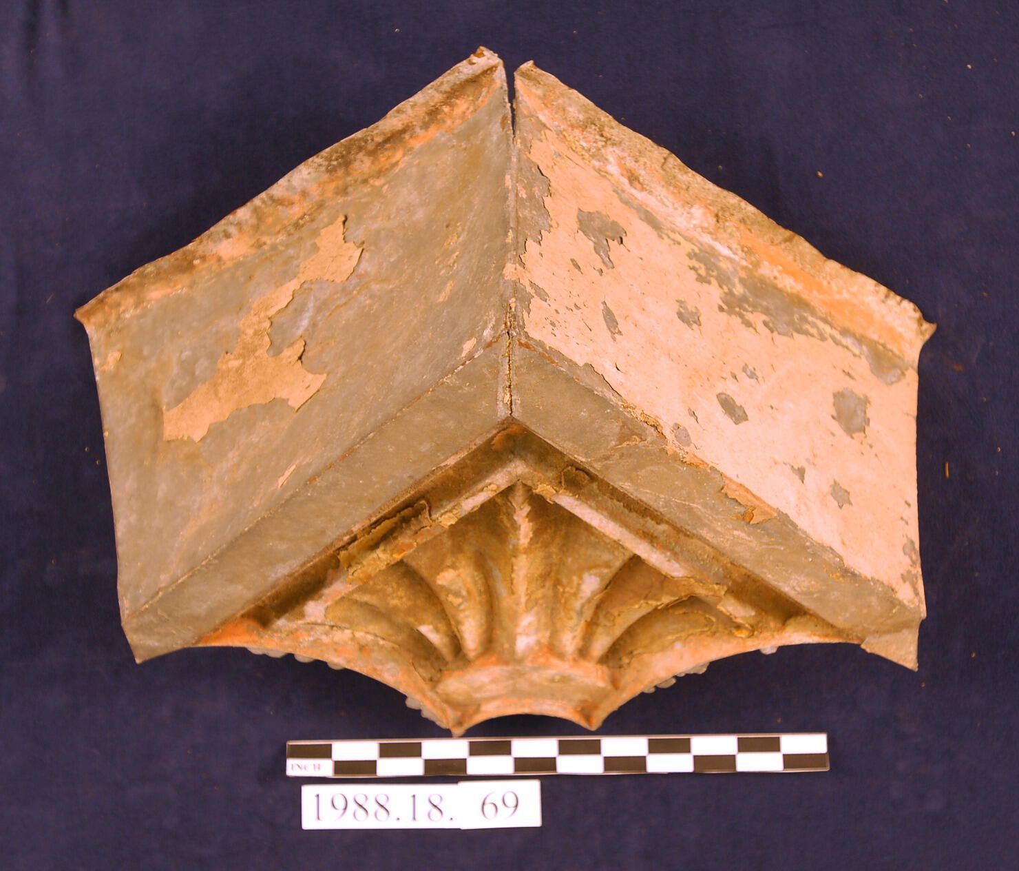 Galvanized sheet iron / steel building component Ornament. Hollow. Triangular. Fluting and molding. Composed of multiple parts soldered together. Remnants of paint.