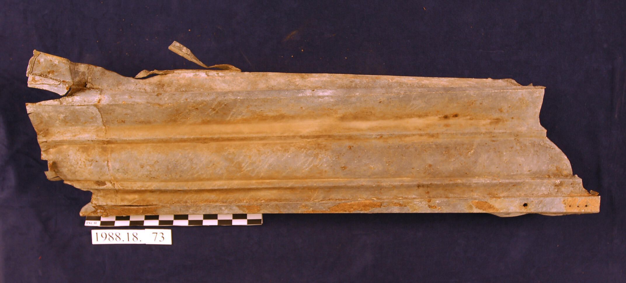 Galvanized sheet iron / steel exterior Cornice section. Compound molding profile. Wood strip attached on back with wire nail.