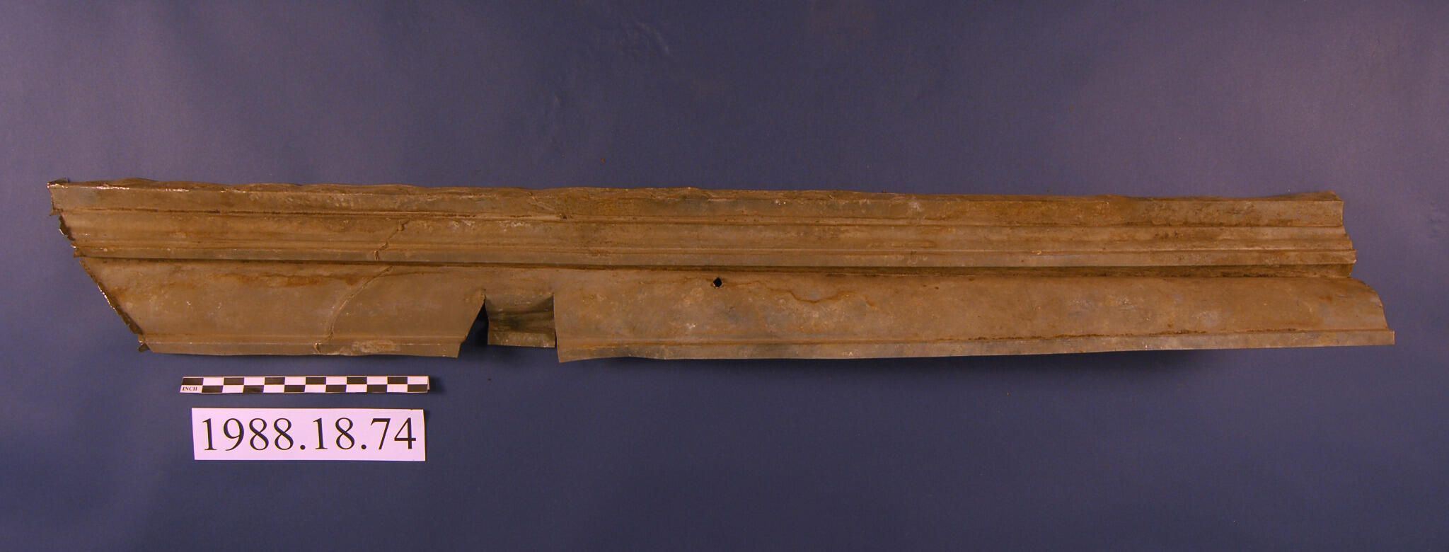 Galvanized iron / steel sheet metal Cornice. Compound molding profile. One end is mitered. One edge has notch. No paint.