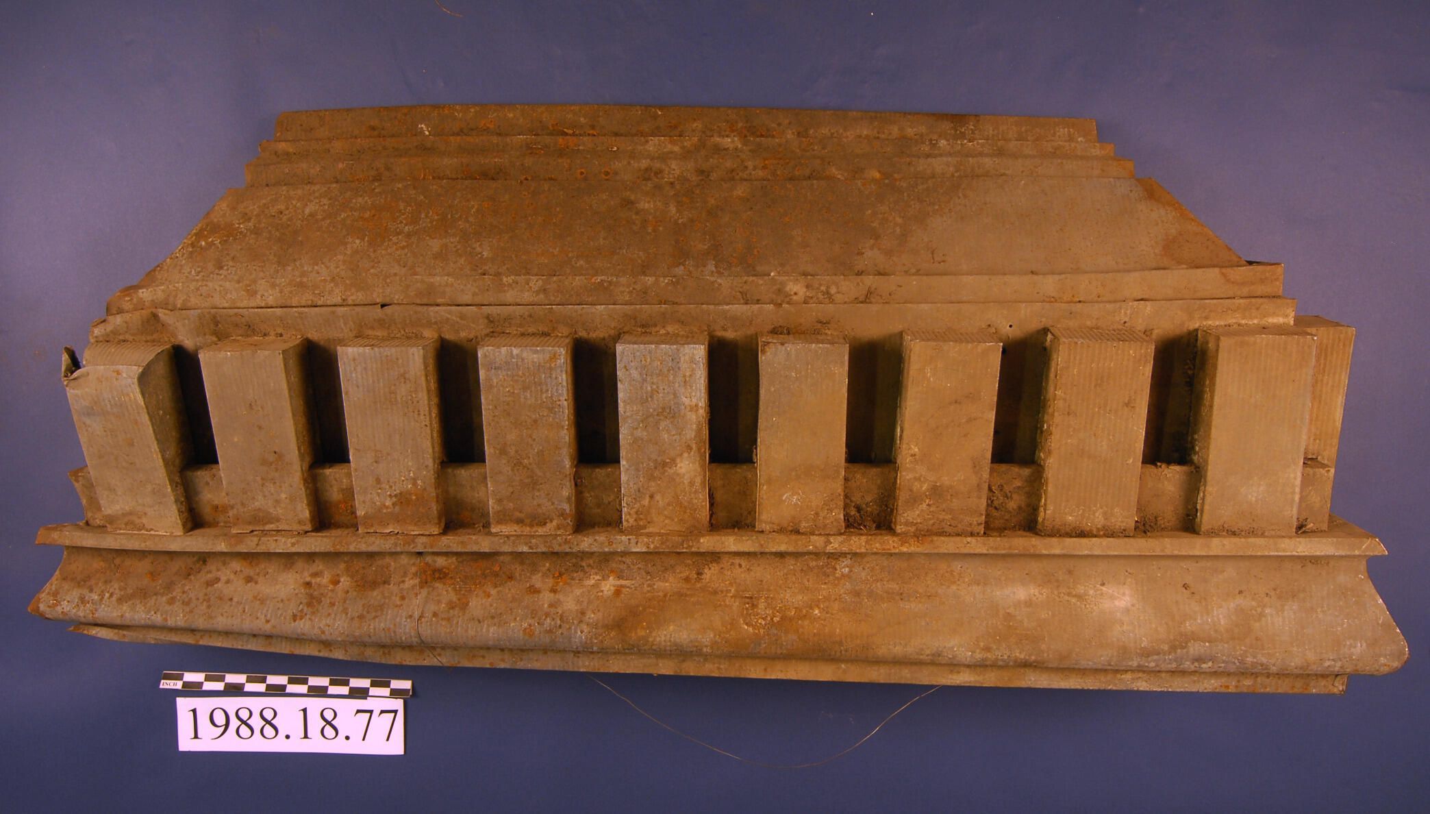 Galvanized sheet iron / steel Cornice. Compound molding profiles. Dentils. Return on left end. Opposite end mitered. Corrugated surface. (No paint).