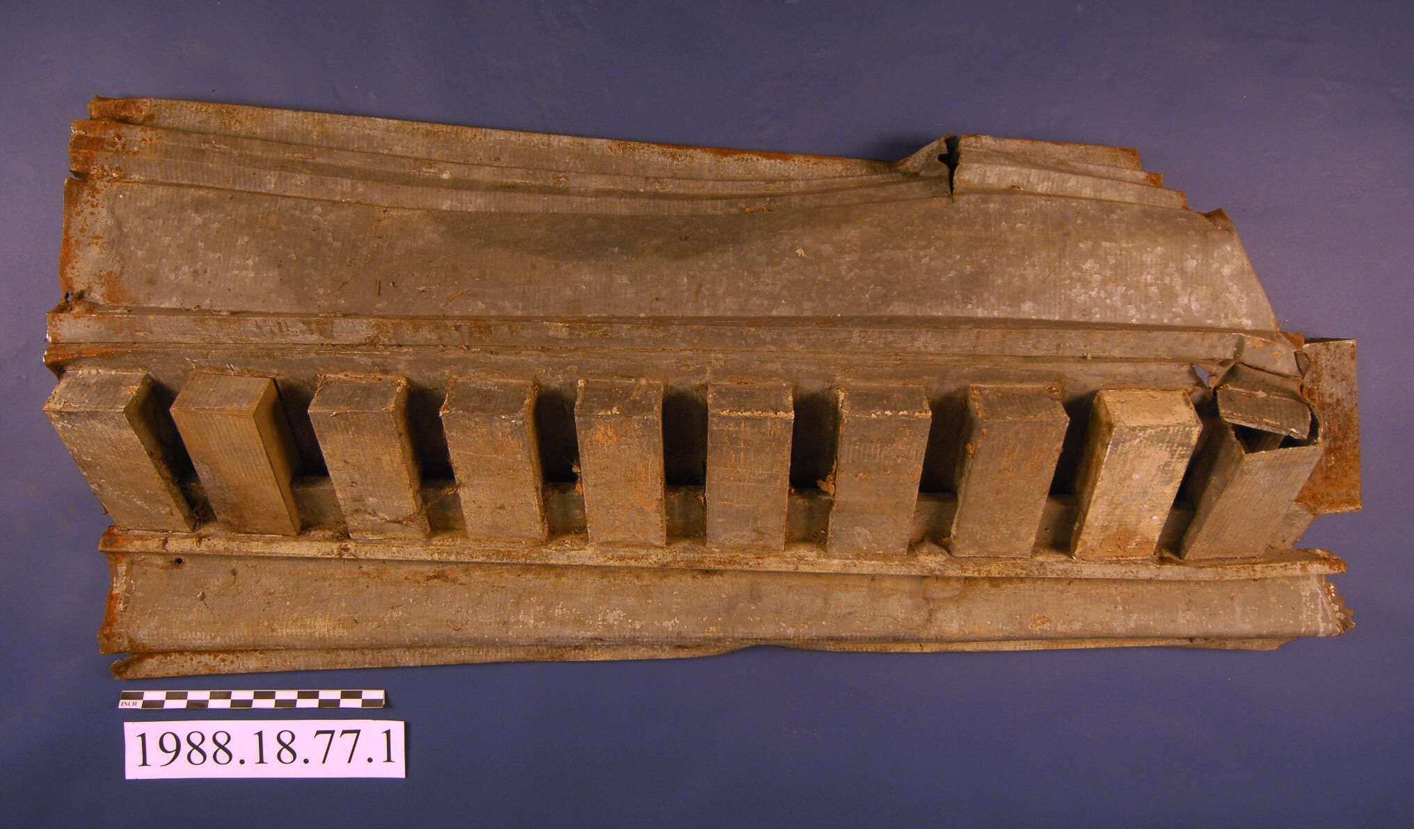 Galvanized sheet iron / steel Cornice. Compound molding profiles. Dentils. Mitered on right end. Corrugated surface. Remnants of paint.