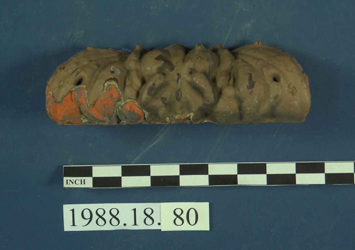 Cast zinc Ornament. Possibly pilaster capital. Botanical Motif. Back is hollow. Has galvanized iron sheet soldered to back edge. Front is painted with multiple layers with red / brown.
