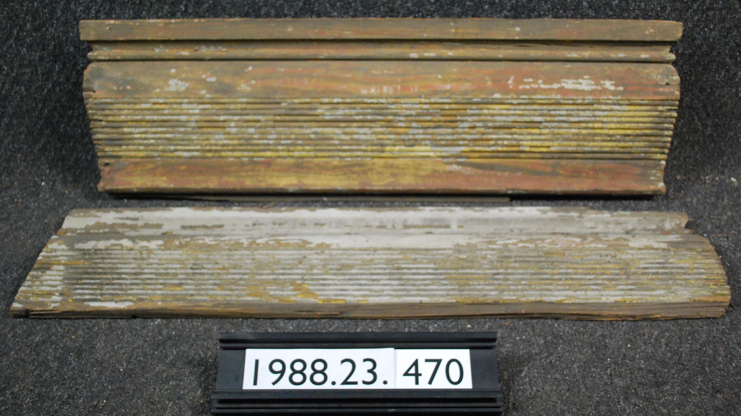 One lot of two exterior (?) wood moldings. Massive width. Compound contour. Edge of one is truncated. The edge is broken. Remnants of peeling paint, lastly grey.
